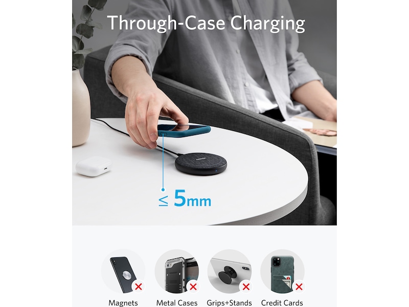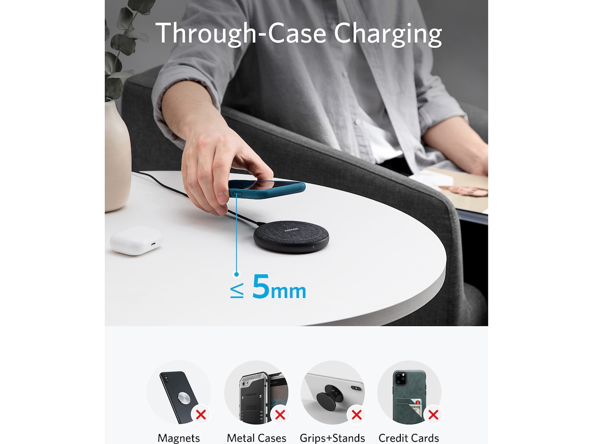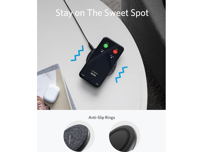 Place your phone or AirPods on the center of the pad and PowerWave will do the rest. Anti-slip silicone rings on the top and bottom help keep your phone on the sweet spot, even when vibrating.