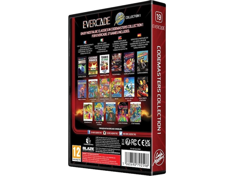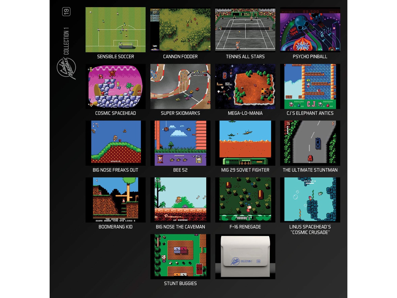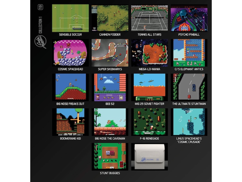 The Codemasters Collection 1 Cartridge for Evercade; 17 of the most renowned games in British gaming history including Sensible Soccer, Cannon Fodder, Linus Spacehead, and an unreleased title, Tennis All-Stars.