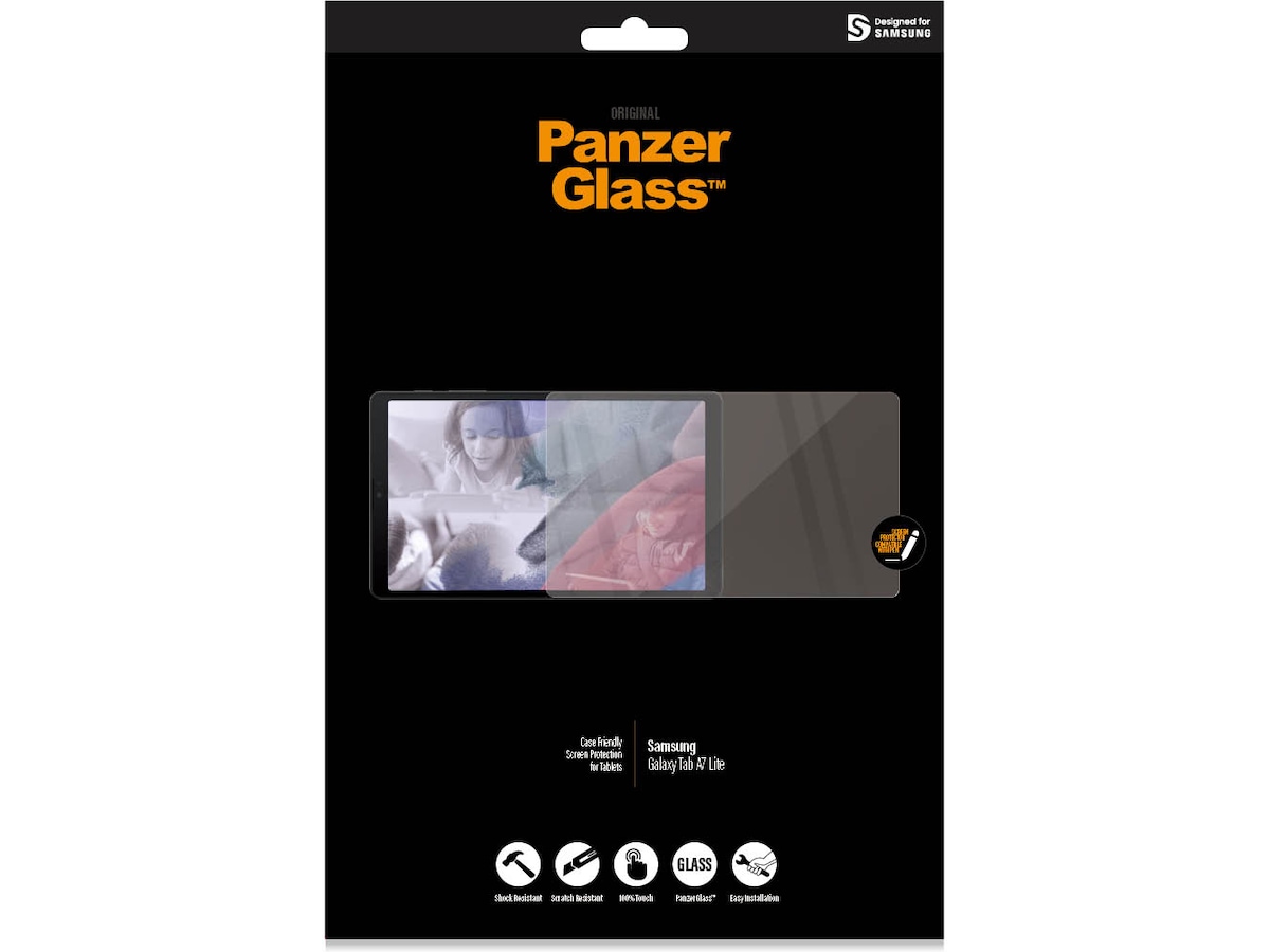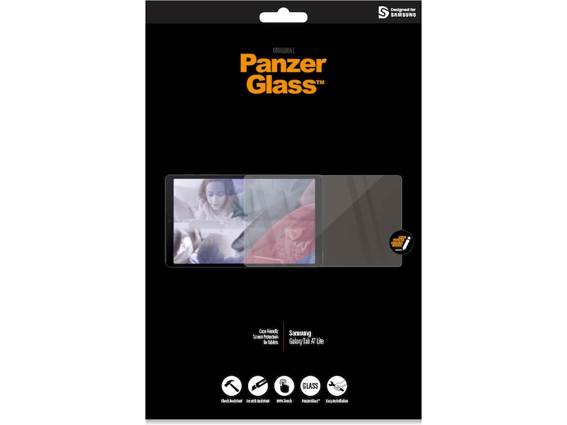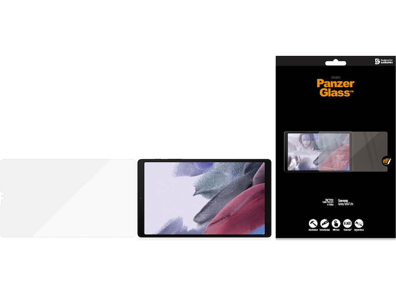 PanzerGlass™ skjermbeskytter for Samsung Galaxy Tab A7 Lite. Kan brukes med deksel. Den gir deg den høyeste standarden for skjermbeskyttere, samtidig som den bevarer 100 % berøringsfølsomhet. For å gjenskape følelsen til det originale displayet er PanzerGlass™ belagt med et oljeavvisende lag som både hemmer bakterievekst og forhindrer at fingeravtrykk fester seg.