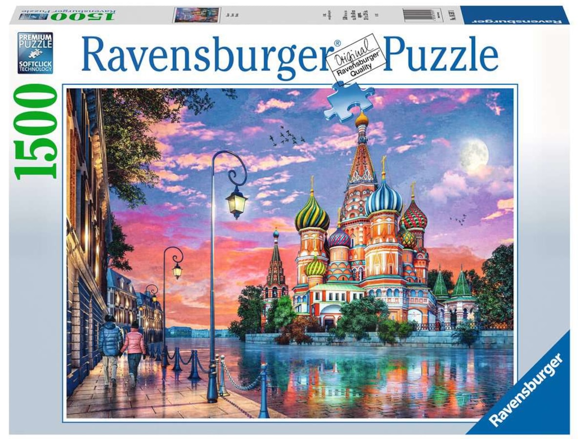 Dette fargerike puslespillet viser den ikoniske Vasilijkatedralen ved solnedgang. Byggingen av denne umiddelbart gjenkjennelige strukturen, et av de fremste symbolene på Russland, ble påbegynt i 1555, på oppdrag av Ivan den grusomme. Puslespillet vårt viser Den røde plass i regnet, med de fargerike bygningene og «løkkuplene» som speiles i dammen på plassen. Et par går hånd i hånd og nyter stillheten og det storslåtte synet foran dem. Glem hverdagens stress og flykt inn i denne uvanlige og romantiske scenen. Dette bildet er spesielt laget for Ravensburger av kunstneren Dominic Davison fra Buckinghamshire.