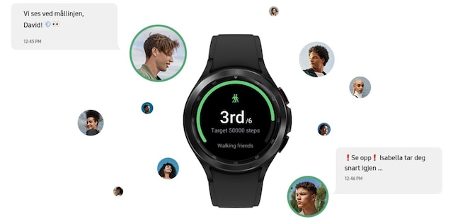 Trening er morsommere sammen. Med Galaxy Watch4 Classic kan du dele hvert skritt – også på avstand. Og nå kan du utfordre og konkurrere med vennene dine. Skritt og aktiviteter oppdateres i sanntid.