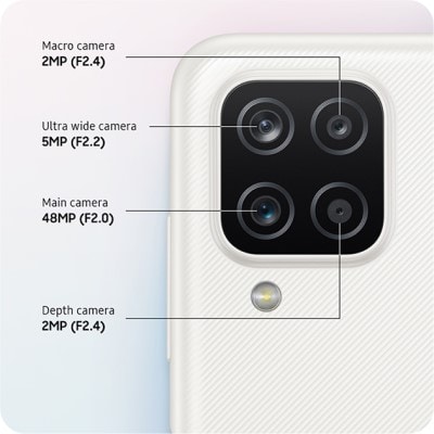 Galaxy A12 er utstyrt med et kraftig batteri på 5000 mAh. Det gir tilstrekkelig plass til å gjøre alt du vil, når du vil. Og med hurtigladeren på 15 W har du alltid nærmest full kraft.