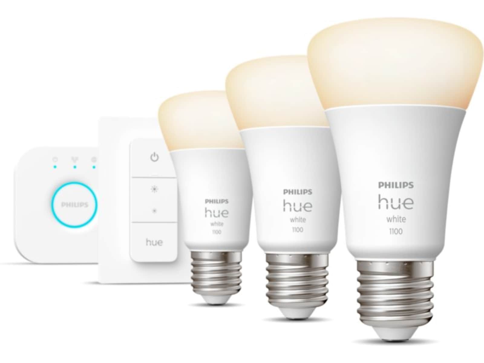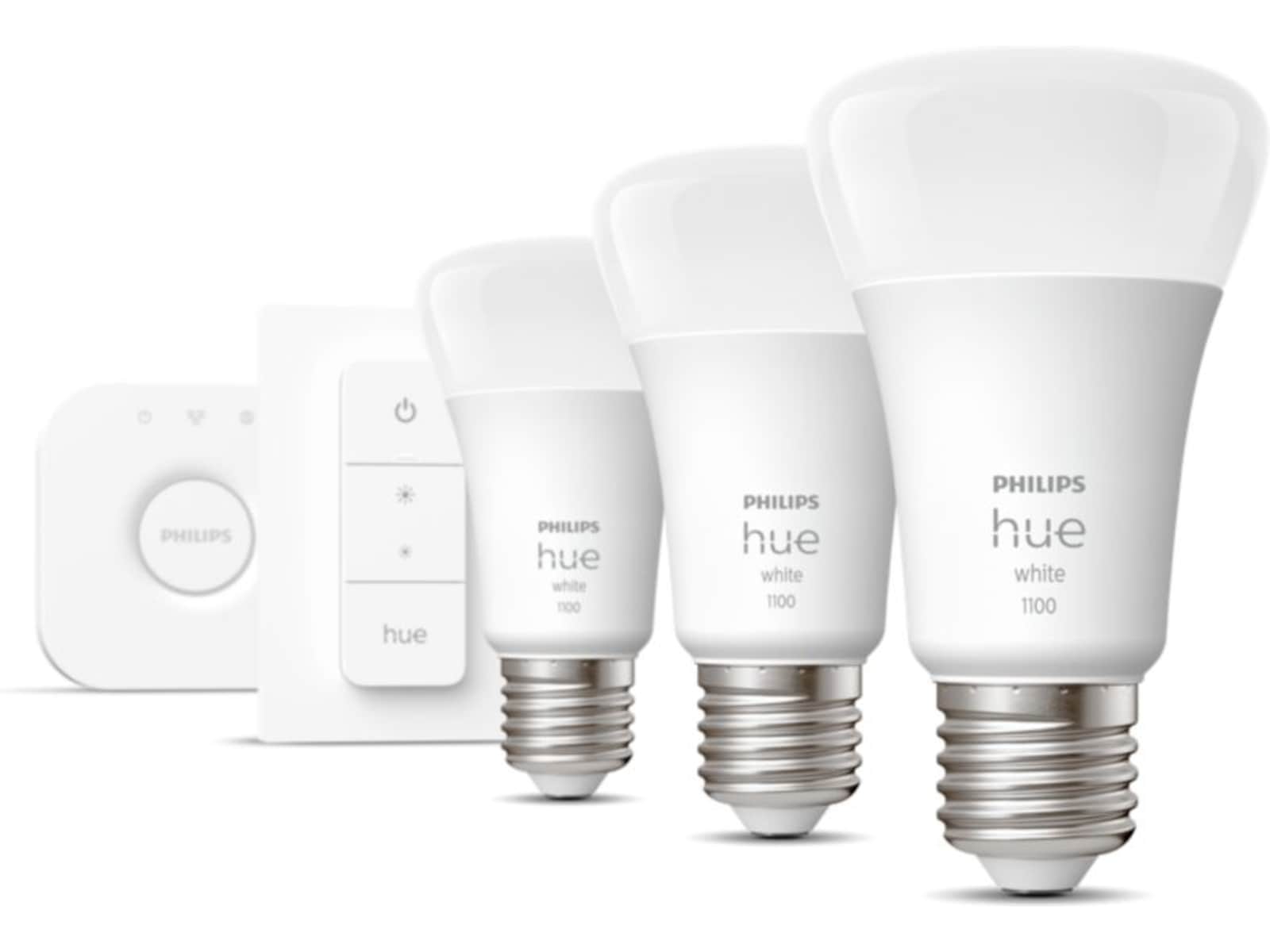 Dette startsettet inneholder tre Philips Hue White-lyskilder med E27-sokkel, samt en Hue Bridge-kontrollenhet for maksimert funksjonalitet og en dimmer som er trådløse veggbrytere som også fungerer som bærbare fjernkontroller.