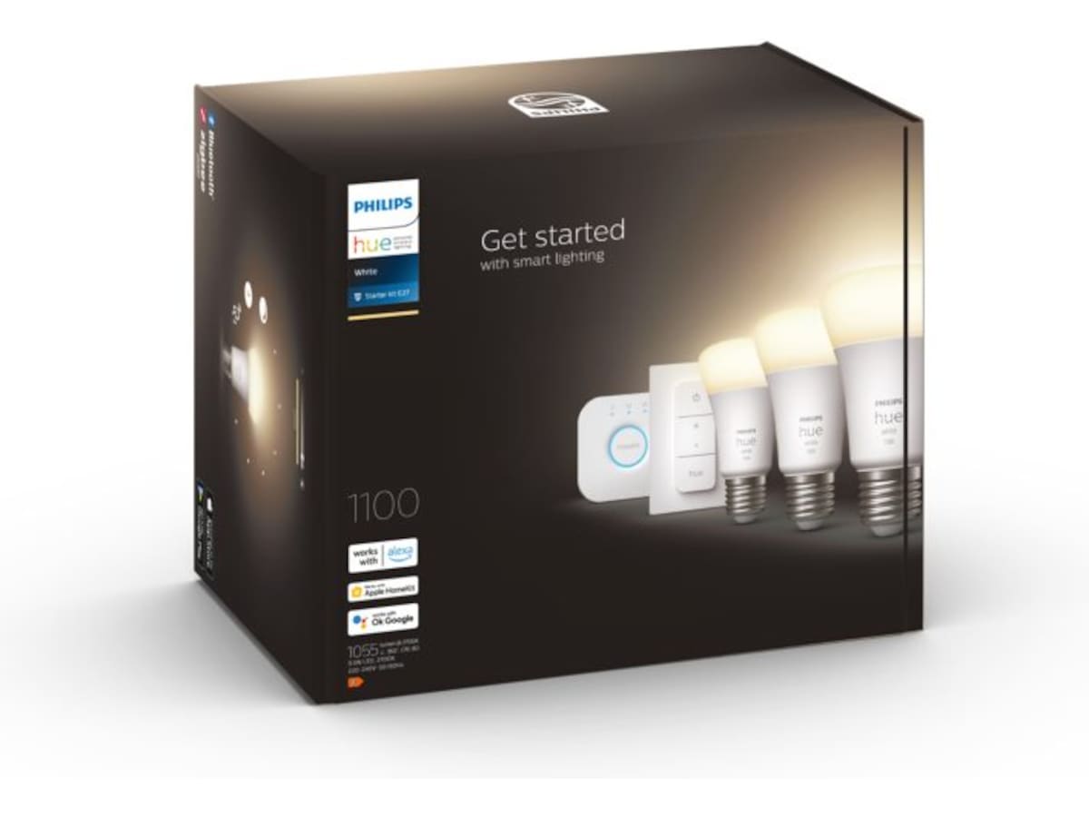 Dette startsettet inneholder tre Philips Hue White-lyskilder med E27-sokkel, samt en Hue Bridge-kontrollenhet for maksimert funksjonalitet og en dimmer som er trådløse veggbrytere som også fungerer som bærbare fjernkontroller.