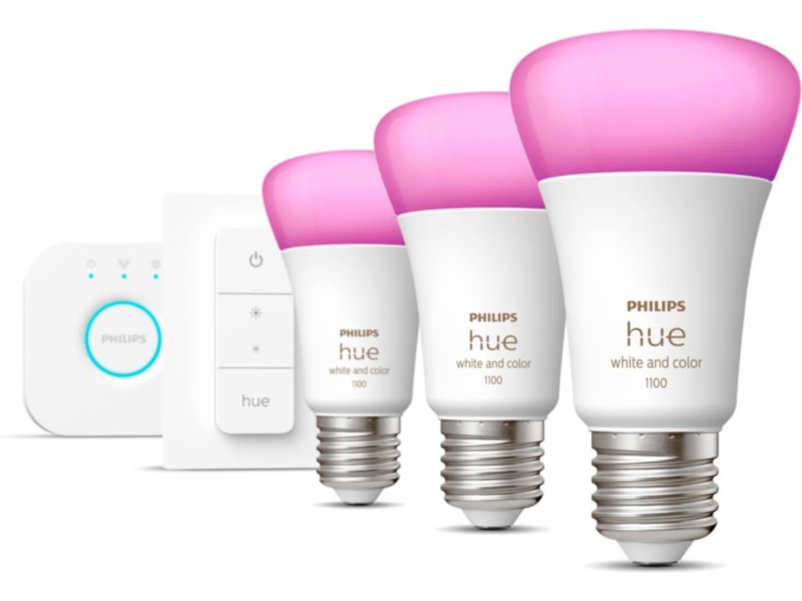 Dette Philips Hue White and color ambiance-startsettet inneholder tre E27 Hue-lyskilder, en Hue Bridge og en Dimmer switch som fungerer både som trådløse veggbrytere og bærbare fjernkontroller.