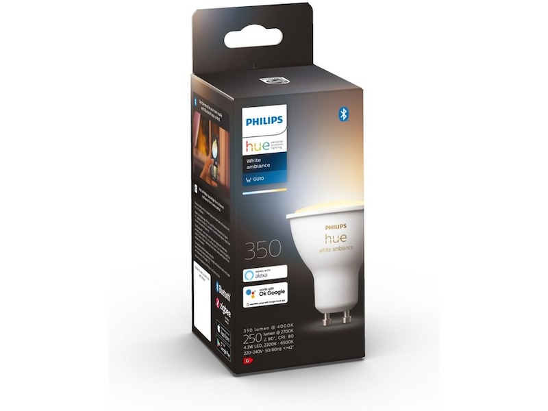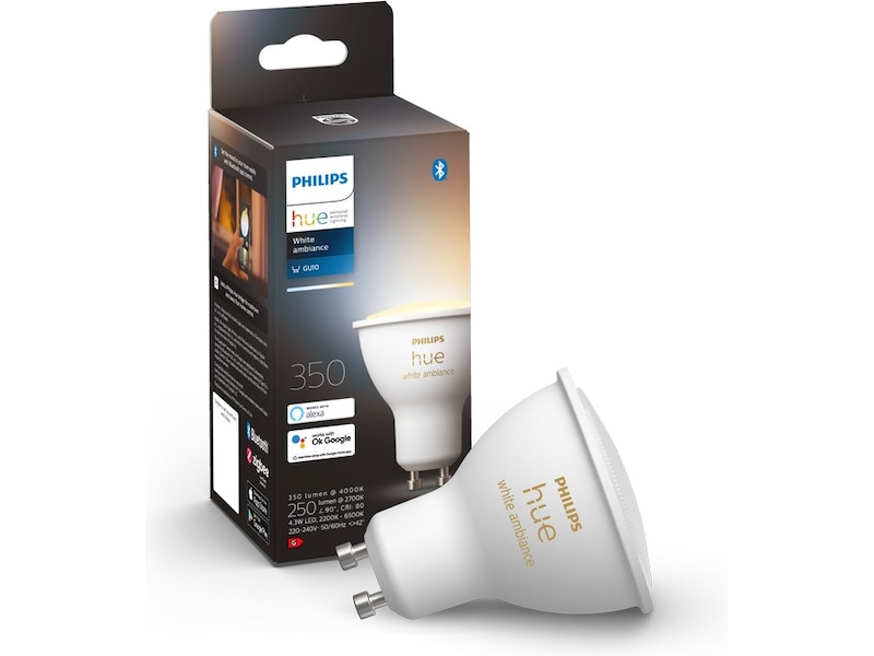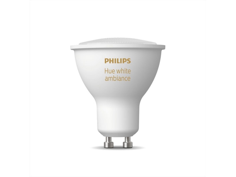 Denne pakken inneholder én 5 W Philips Hue White ambiance LED-spotlight (50 W-ekvivalent) med GU10-sokkel, en serie som lar deg dimme lysene både med tanke på lyseffekt (lumen) og lystemperatur (kelvin), slik at du kan veksle mellom kaldt og varmt lys etter behov.