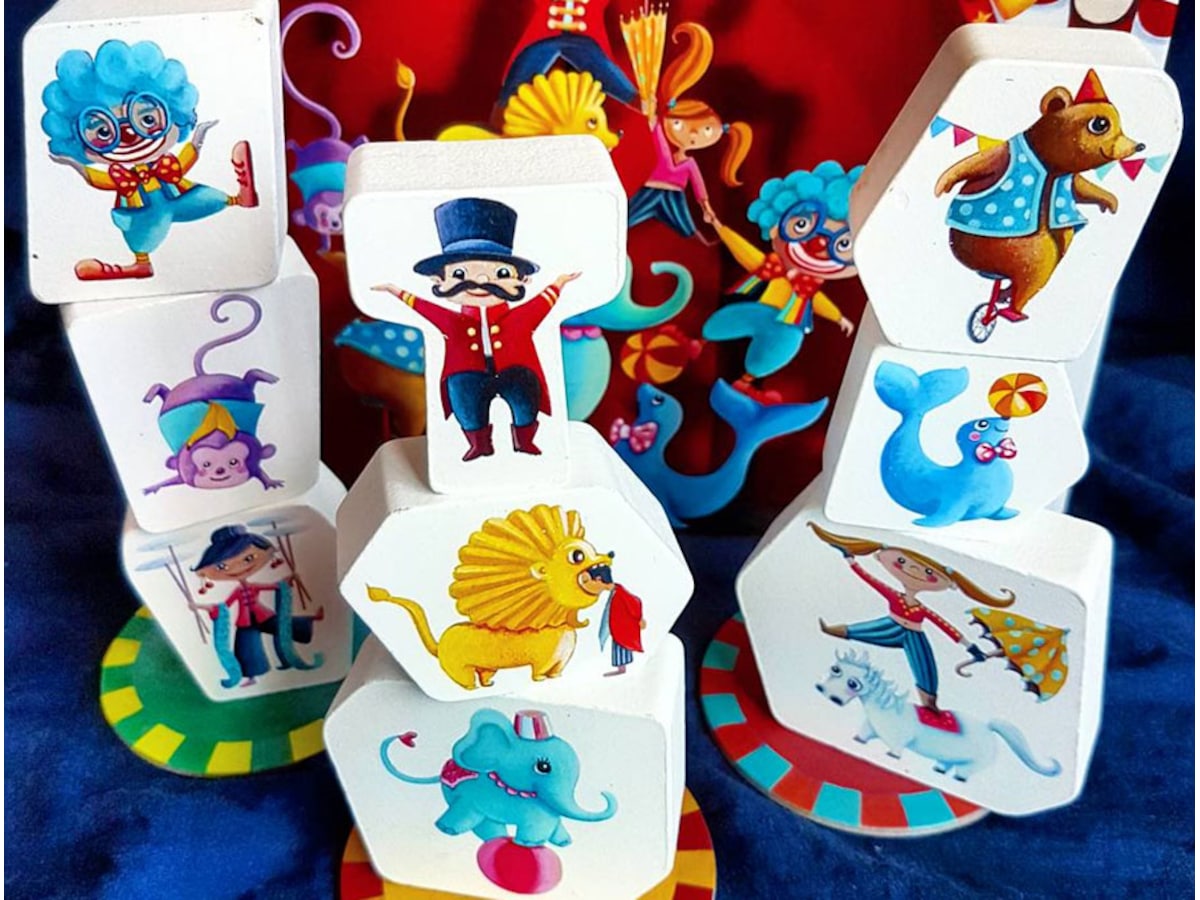Kan du stable et sirkus på beina? Spillerne skal stable et tårn av klossene, så de passer med de kortene de har. Hvem kan holde balansen? Hvem får alt til å velte?