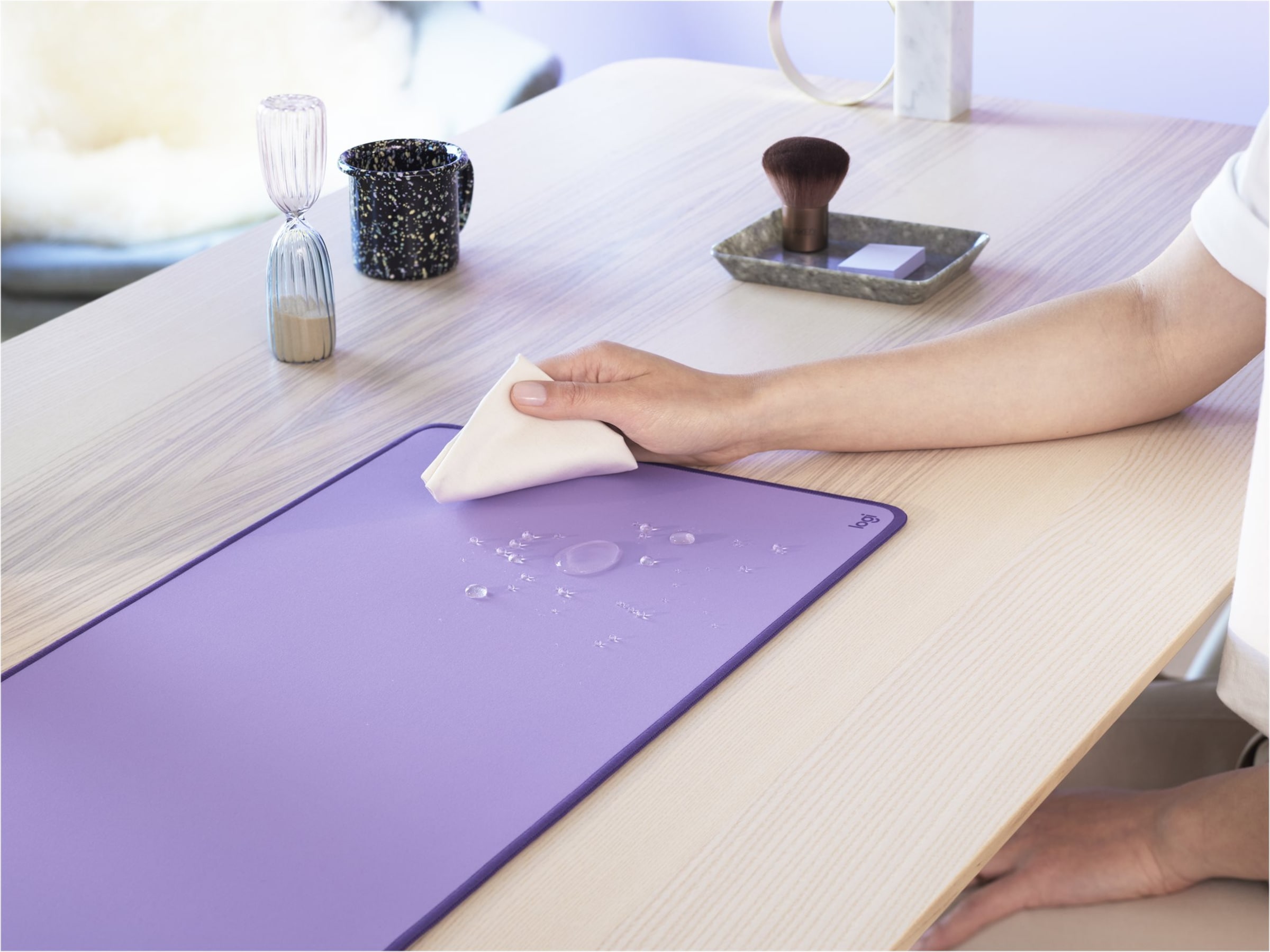 Logitech Desk Mat har et sølebestandig belegg som tåler små uhell, og væske kan enkelt tørkes vekk med en fuktig klut.