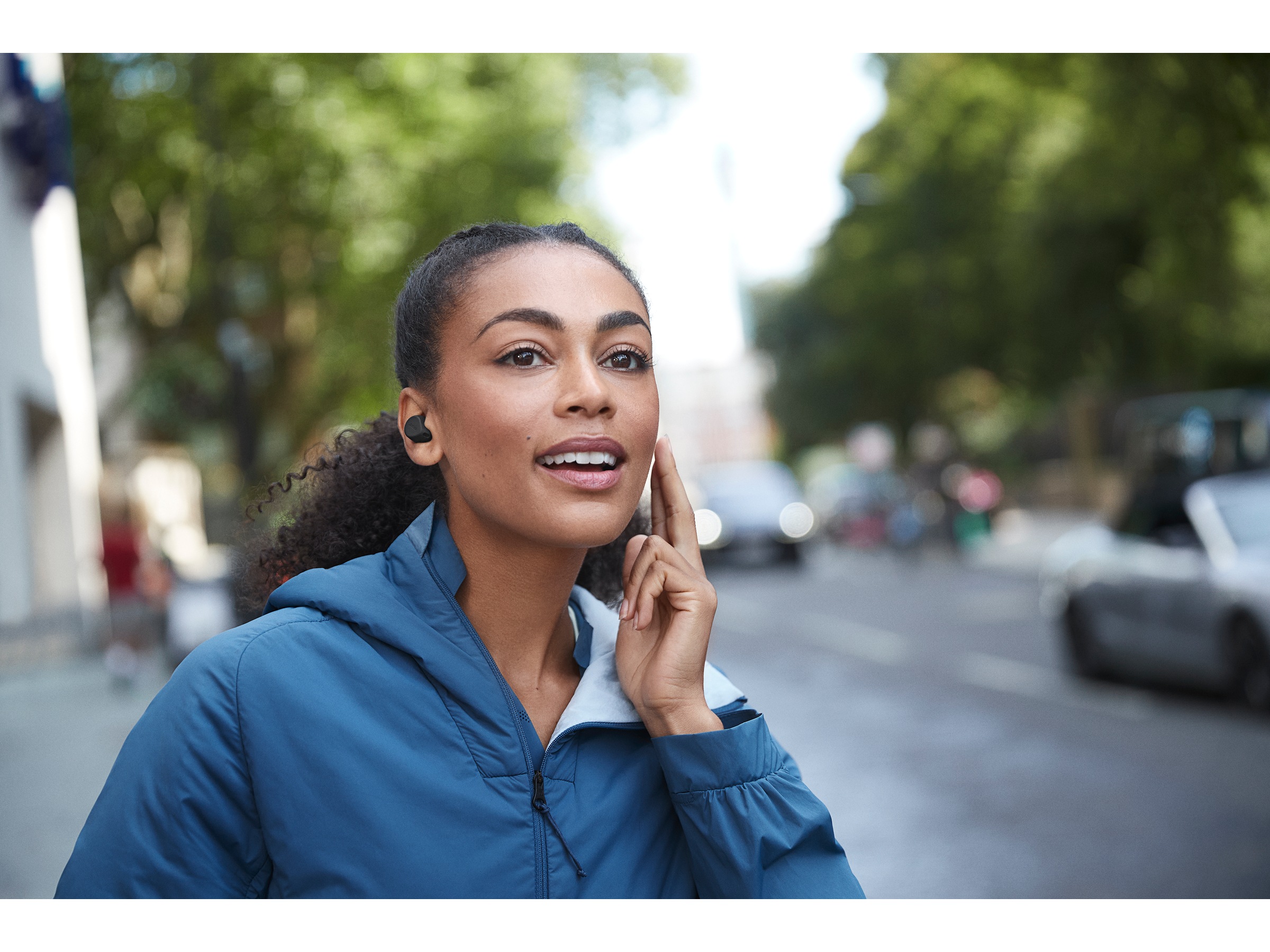 Vår kraftige justerbare aktive støydemping (ANC) blokkerer distraherende bakgrunnsstøy umiddelbart, ved å trykke på en knapp. Bare velg ett av våre fem nivåer av støydemping i appen Jabra Sound+, og hold fokus på treningen uansett.