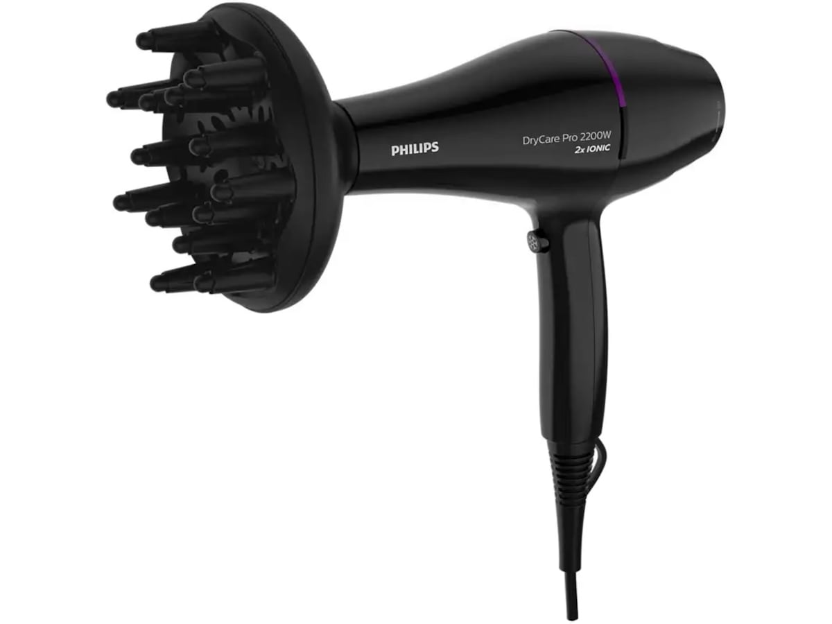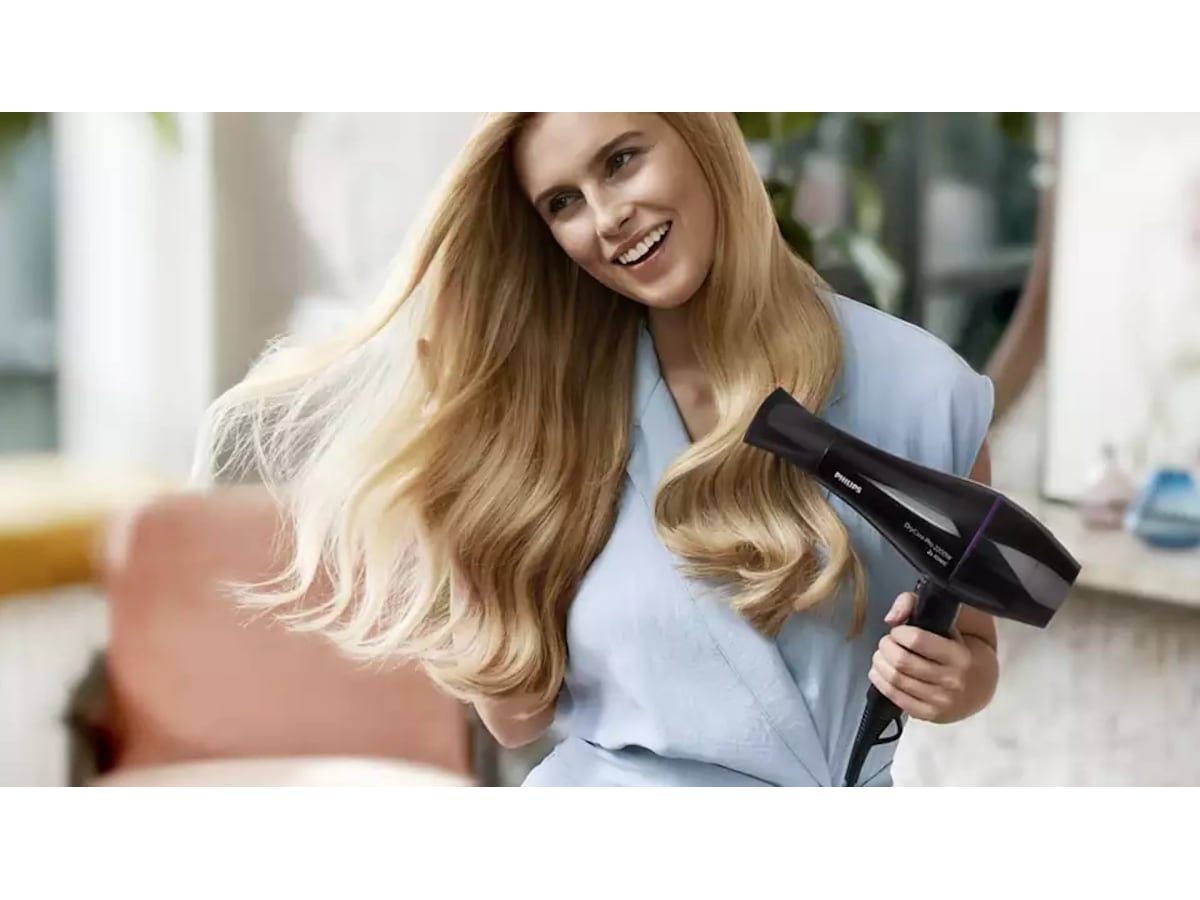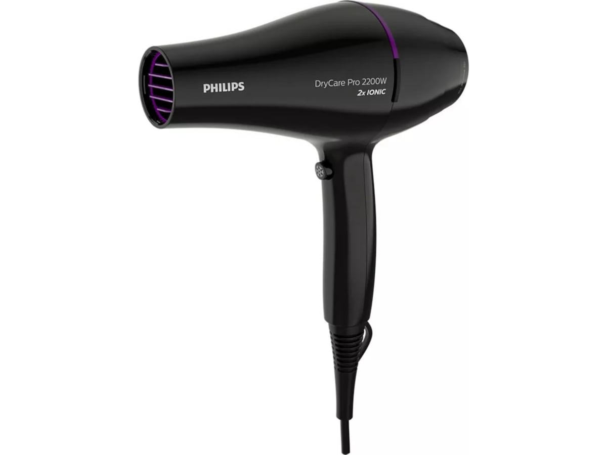 DryCare Pro fra Philips på 2200 W har en vekselstrømsmotor med høy ytelse og er utviklet for det profesjonelle markedet. Den har en lufthastighet på opptil 130 km/t for raske og effektive resultater.