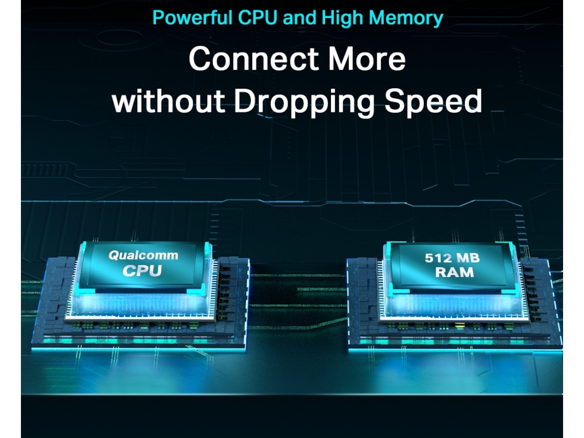 Bak WiFi 6-teknologistrukturen finnes det avanserte Qualcomm-brikkesettet og høyt minne. Få gleden av raske tilkoblinger med minimal ventetid selv under en stor overføringsbelastning. Hvert klikk for nettstedkoblinger og online-avspilling på laptopen og telefonen responderer raskere.