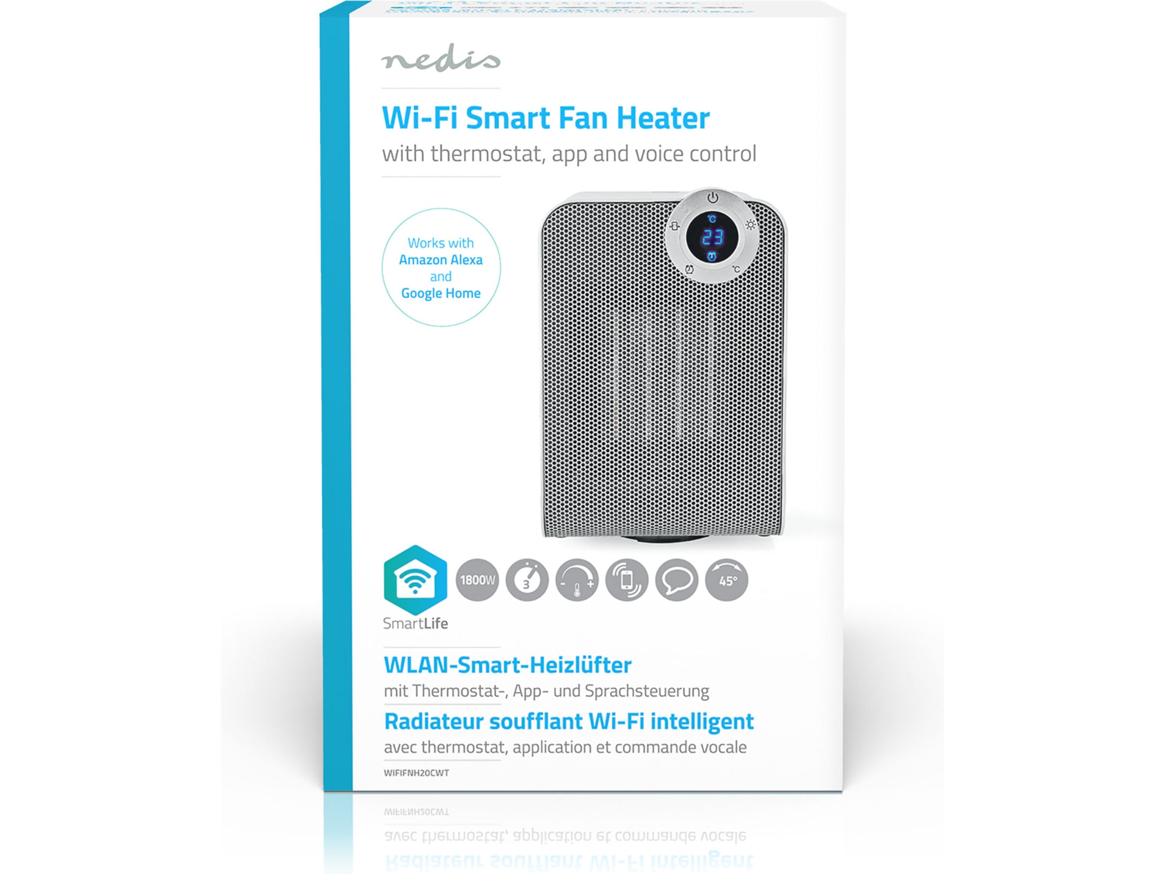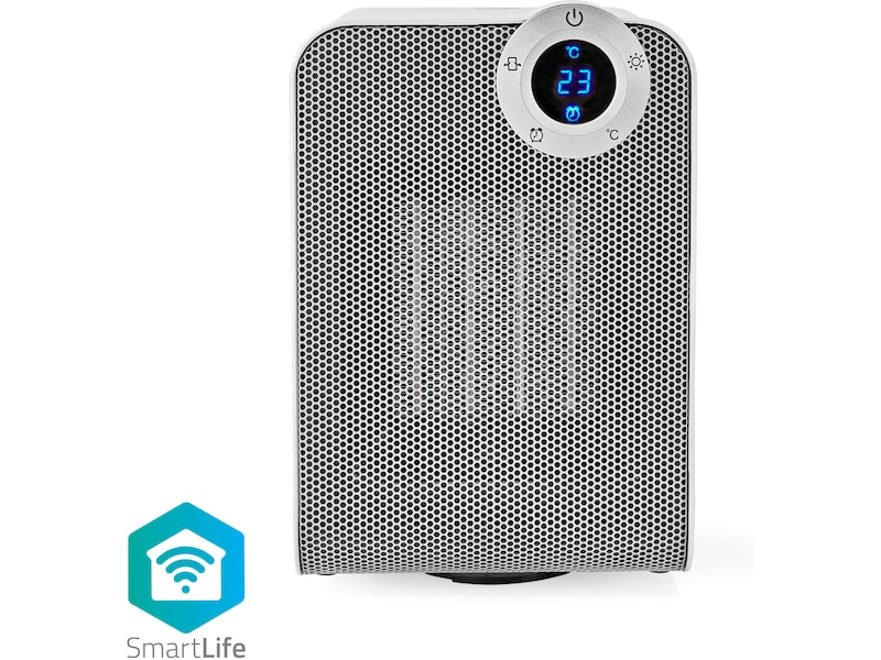 • Angi temperatur ved hjelp av knappene på frontpanelet, Nedis® SmartLife-appen eller en talekommando i kombinasjon med Google Home eller Amazon Alexa • Kobles direkte til Wi-Fi-en slik at du kan kontrollere den fra hvor som helst i verden • Sett en tidtaker eller en tidsplan for automatisk oppvarming • Varmeapparatet bruker hele 1800 W til raskt å varme opp rommet. Når den nærmer seg den ønskede temperaturen, reduseres varmeeffekten automatisk til 1000 W • Aktiver den horisontale panoreringen for optimal luftstrøm i hele rommet • Det lille fotavtrykket gjør dette kraftige varmeapparatet egnet for små rom