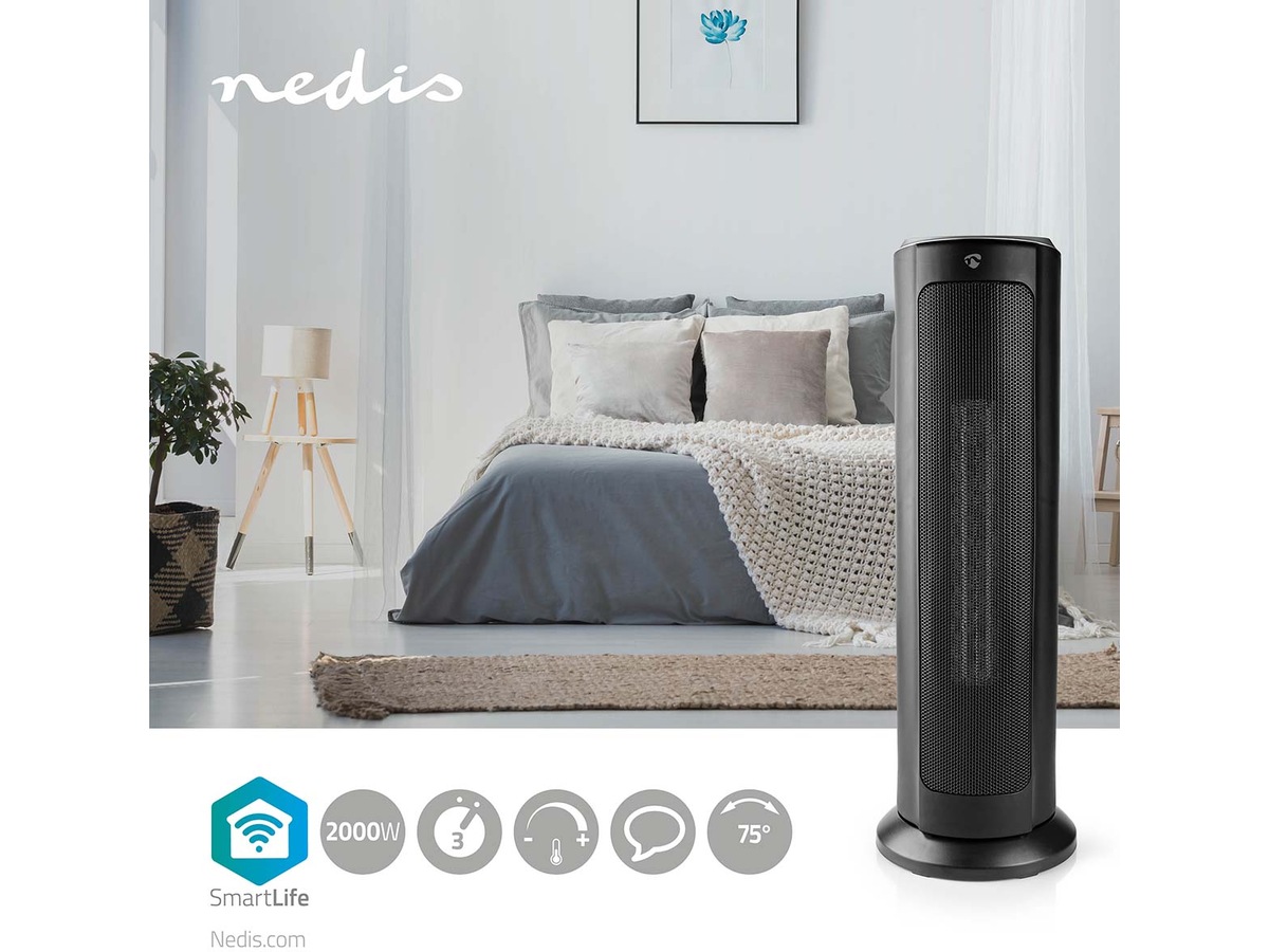 Den kan betjenes ved hjelp av de fysiske knappene øverst - eller eksternt via Nedis SmartLife-appen - for å stille inn temperaturen, varmeeffekten, den horisontale panoreringen eller du kan stille den inn på tid eller etter en tidsplan.
