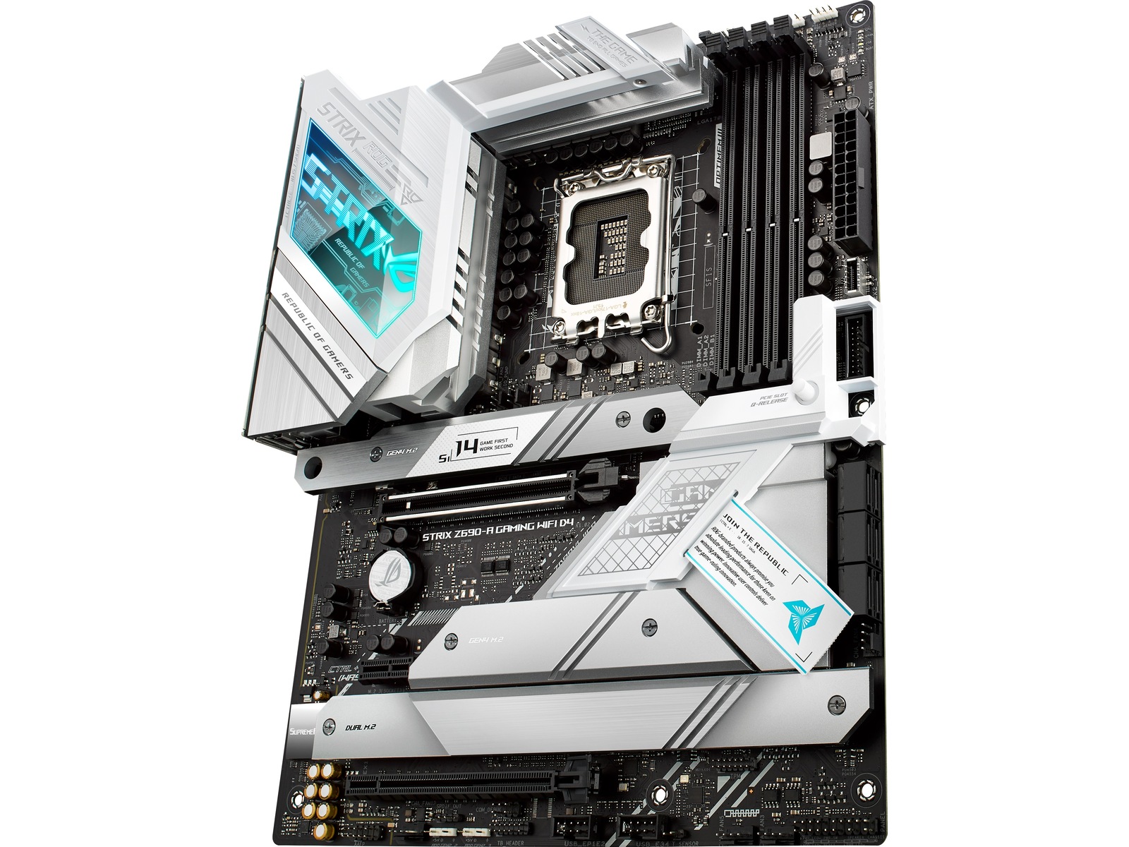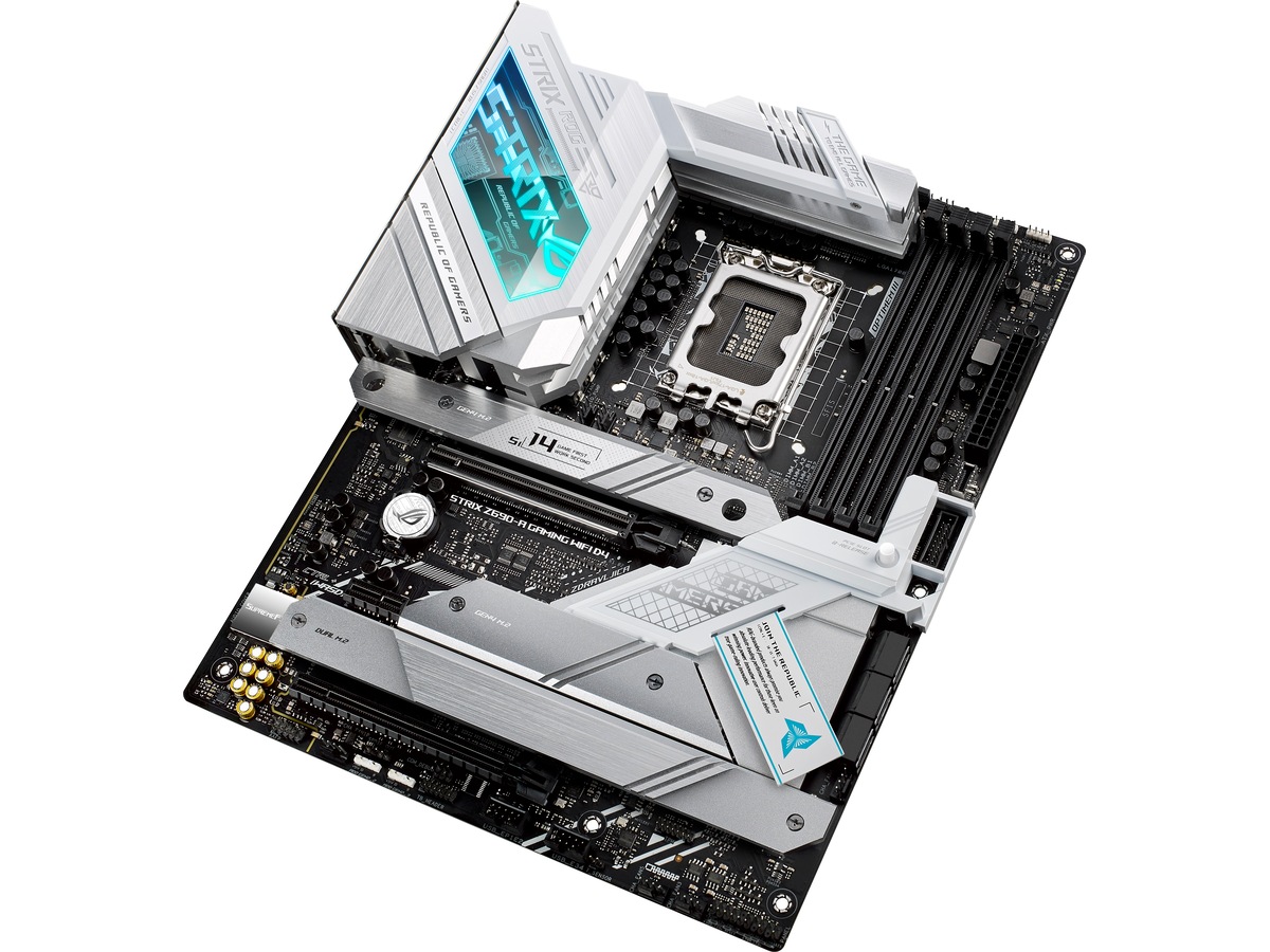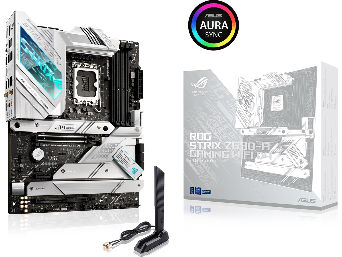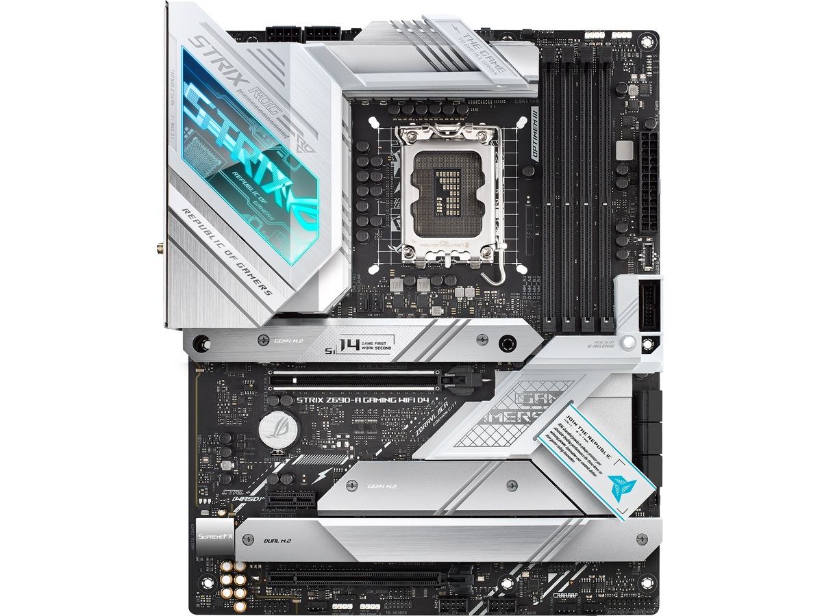 ROG STRIX Z690-A GAMING WIFI D4 The ROG Strix Z690-A Gaming WiFi D4 motherboard deploys robust power delivery and cooling to unleash the full force of 12th Gen Intel® Core™ processors, all orchestrated by ASUS-exclusive intelligent controls that deliver advanced user experiences. Meanwhile, onboard WiFi 6 and ample PCIe® 4.0 M.2 slots bring the speed that you need, and DIY-friendly innovations help simplify the PC building process. To top it all off, Strix Z690-A Gaming WiFi D4 dazzles with customizable RGB lighting and a refined brushed-metal finish. All-round Performance - ROG Strix Z690-A Gaming WiFi D4 provides up-rated power delivery and optimized cooling to push any gaming build to its limits. Intelligent controls enable easy management of overclocking, cooling and networking settings, while Two-Way AI Noise Cancelation ensures crystal-clear in-game communication. ROG Strix Z690-A Gaming WiFi D4 is armed with all the essentials required to create a gaming PC with top-tier performance.