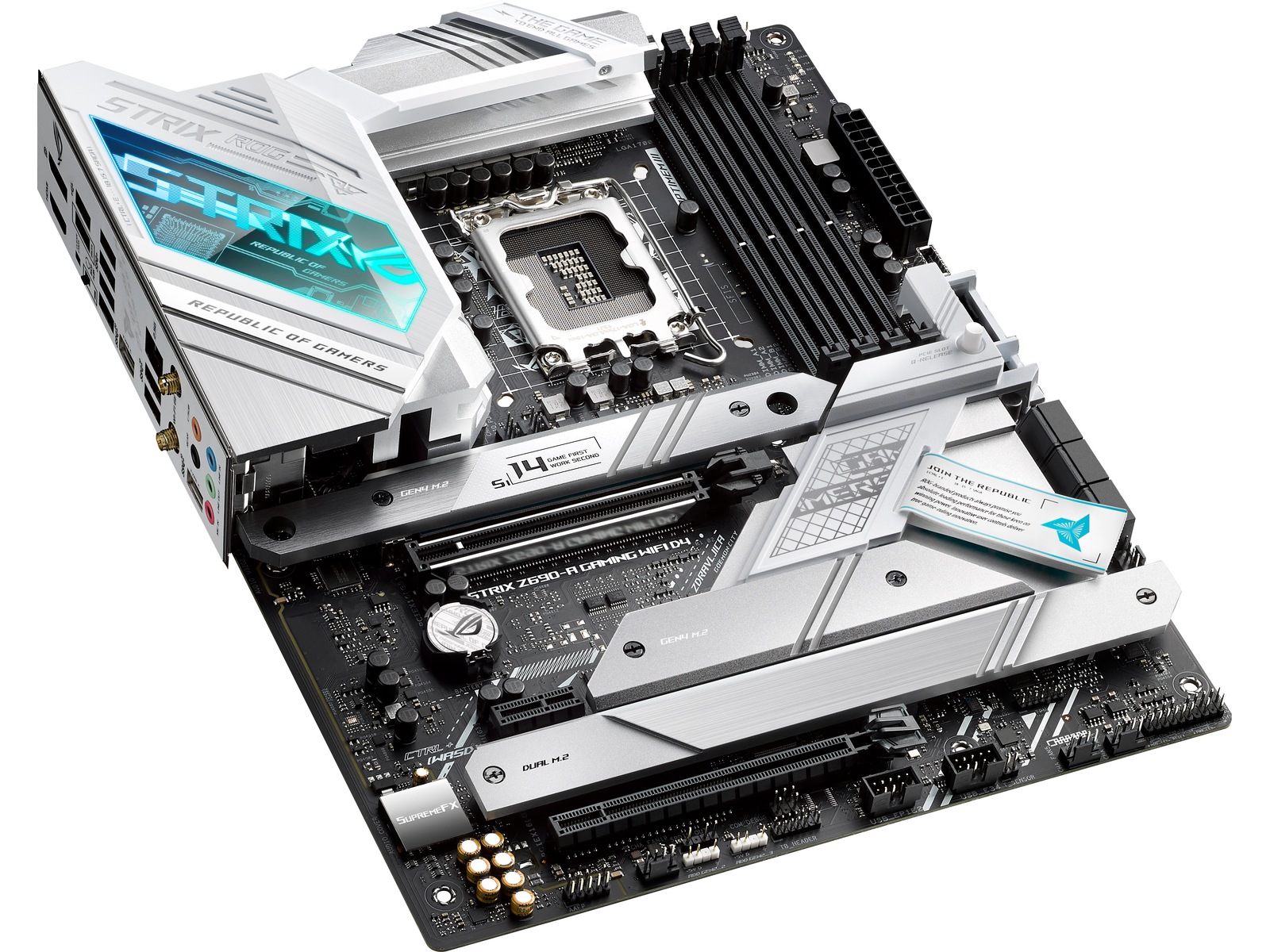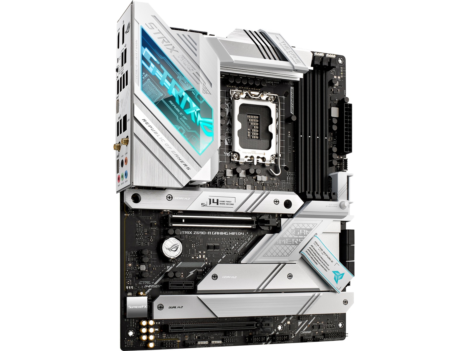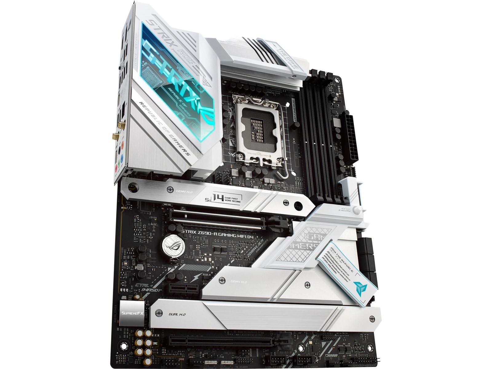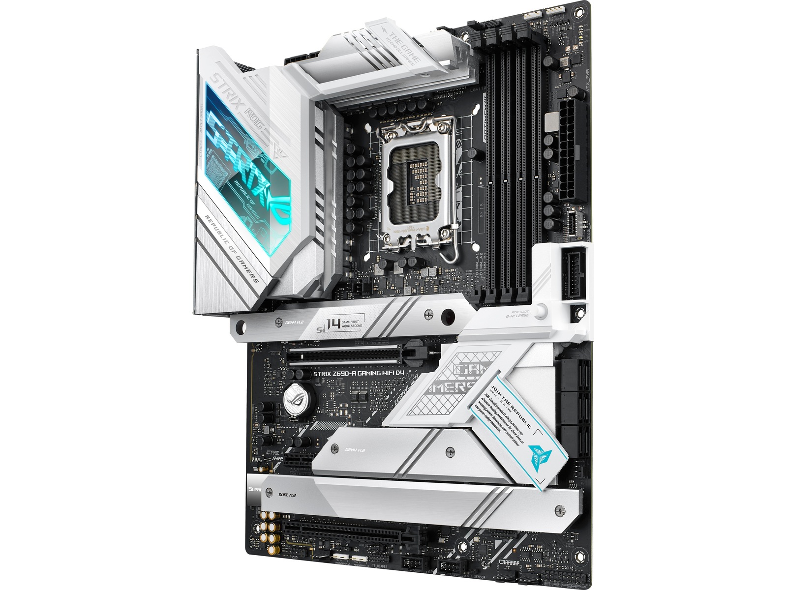 ROG STRIX Z690-A GAMING WIFI D4 The ROG Strix Z690-A Gaming WiFi D4 motherboard deploys robust power delivery and cooling to unleash the full force of 12th Gen Intel® Core™ processors, all orchestrated by ASUS-exclusive intelligent controls that deliver advanced user experiences. Meanwhile, onboard WiFi 6 and ample PCIe® 4.0 M.2 slots bring the speed that you need, and DIY-friendly innovations help simplify the PC building process. To top it all off, Strix Z690-A Gaming WiFi D4 dazzles with customizable RGB lighting and a refined brushed-metal finish. All-round Performance - ROG Strix Z690-A Gaming WiFi D4 provides up-rated power delivery and optimized cooling to push any gaming build to its limits. Intelligent controls enable easy management of overclocking, cooling and networking settings, while Two-Way AI Noise Cancelation ensures crystal-clear in-game communication. ROG Strix Z690-A Gaming WiFi D4 is armed with all the essentials required to create a gaming PC with top-tier performance.