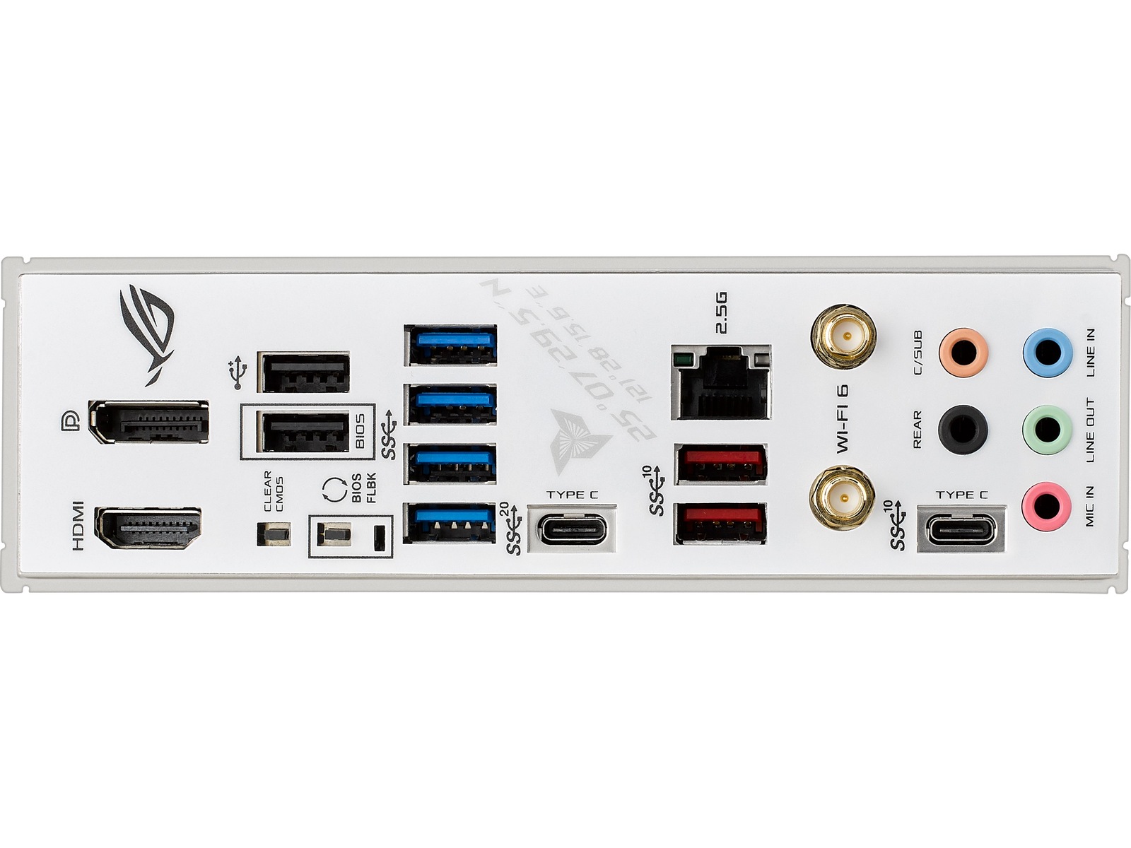 1 x lydutlinje (bakre) - minijakk, 1 x lydutlinje (senter/subbasshøyttaler) - minijakk, 1 x LAN (2.5Gigabit Ethernet), 1 x USB-C Gen2x2, 1 x lydinnlinje - minijakk, 2 x USB 2.0, 1 x DisplayPort, 1 x USB-C Gen2, 4 x USB 3.2 Gen 1, 1 x mikrofon - minijakk, 1 x lydutlinje - minijakk, 1 x HDMI, 2 x USB 3.2 Gen 2