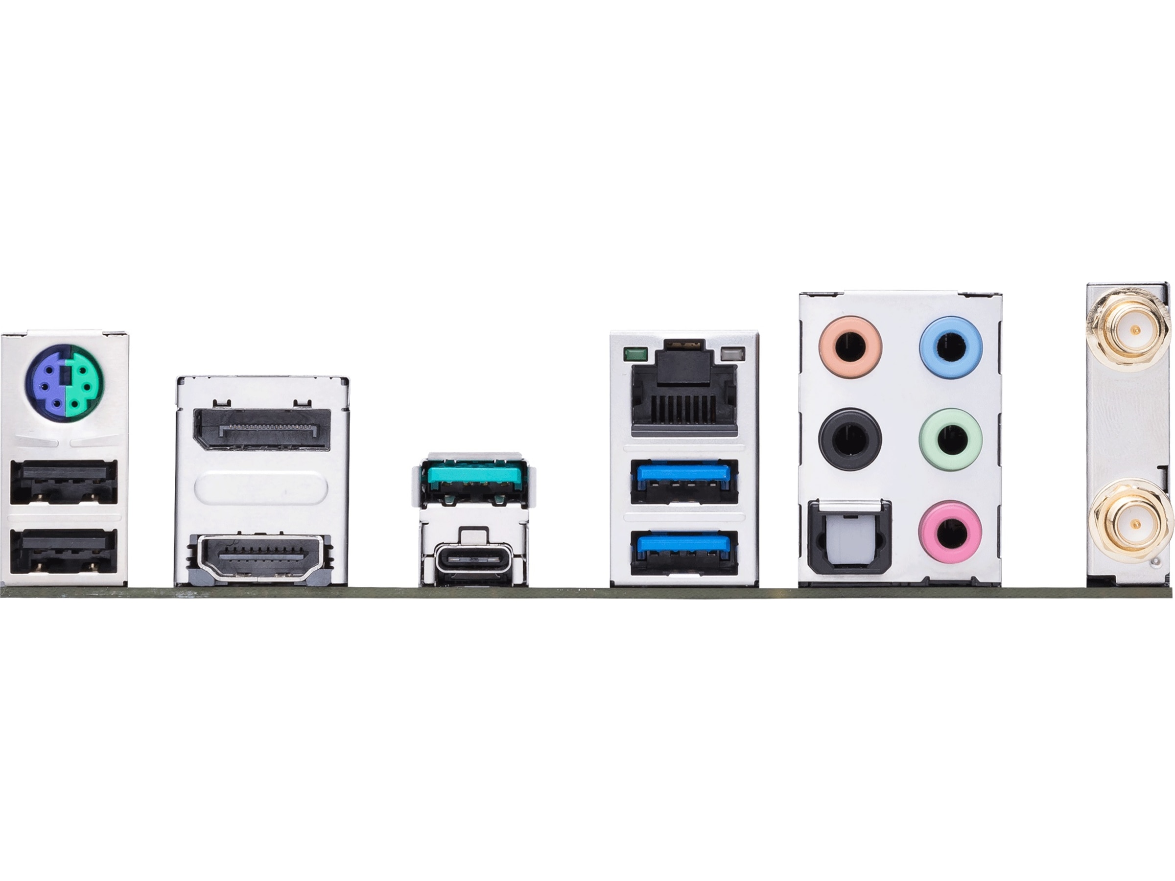 1 x USB-C Gen2x2, 1 x USB 3.2 Gen 2, 1 x HDMI, 2 x USB 2.0, 1 x LAN (2.5Gigabit Ethernet), 1 x mikrofon - minijakk, 1 x TOSLINK, 1 x lydutlinje (bakre) - minijakk, 1 x lydinnlinje - minijakk, 1 x lydutlinje - minijakk, 1 x PS/2-tastatur / -mus, 1 x DisplayPort, 1 x lydutlinje (senter/subbasshøyttaler) - minijakk, 2 x USB 3.2 Gen 1