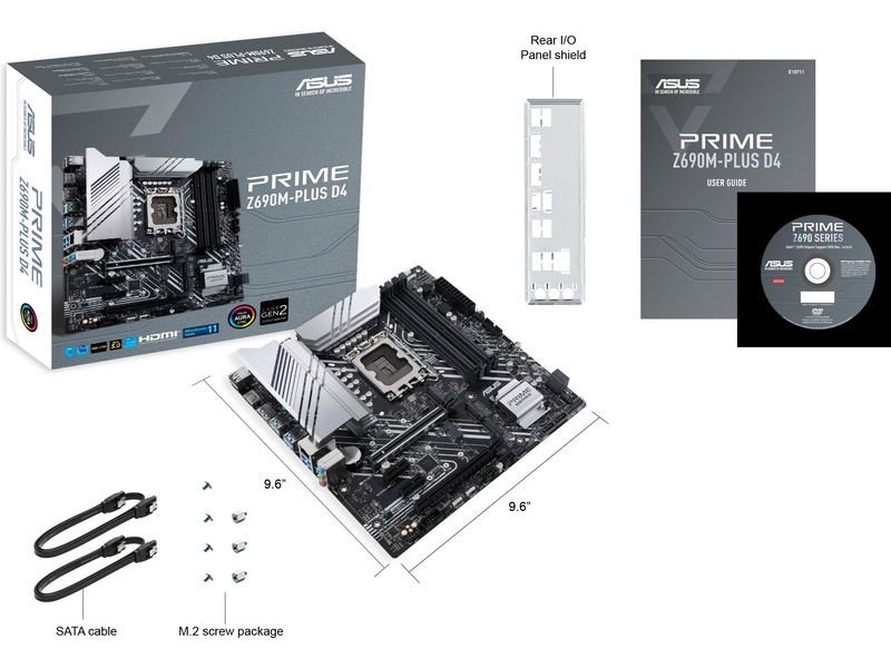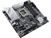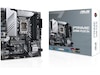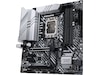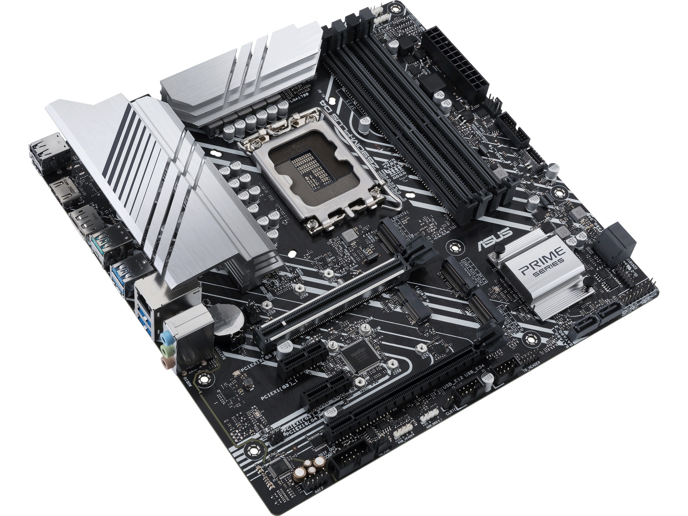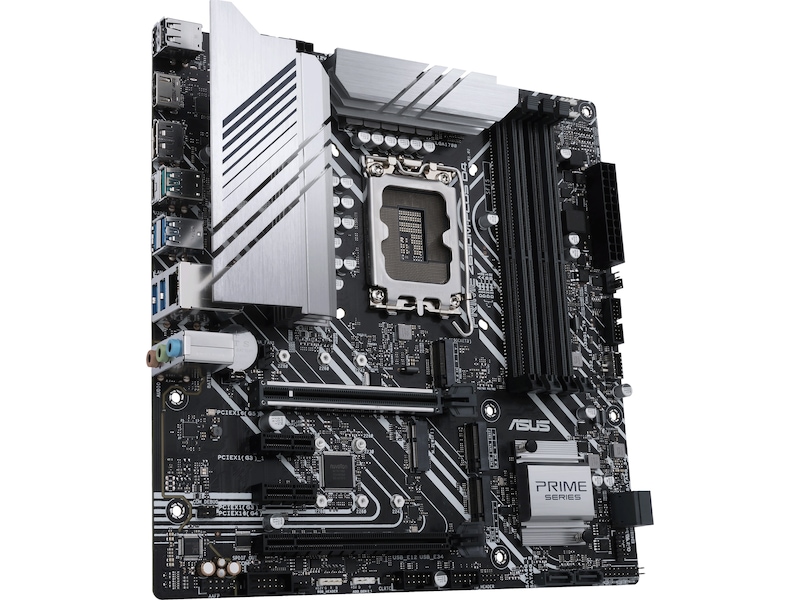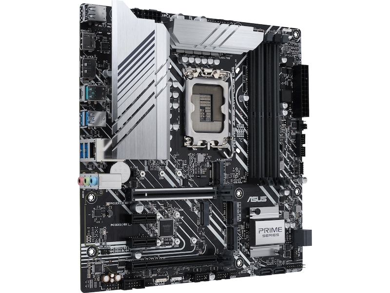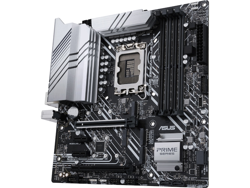 ASUS Prime Z690M-Plus D4 har en elegant design med et futuristisk utseende, med svart og hvit finish, romferge-inspirerte designelementer, metallisk navneskilt og kretskortdeksel.