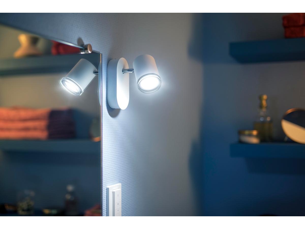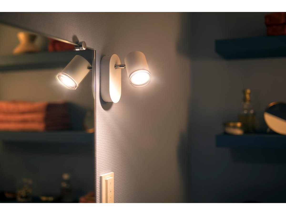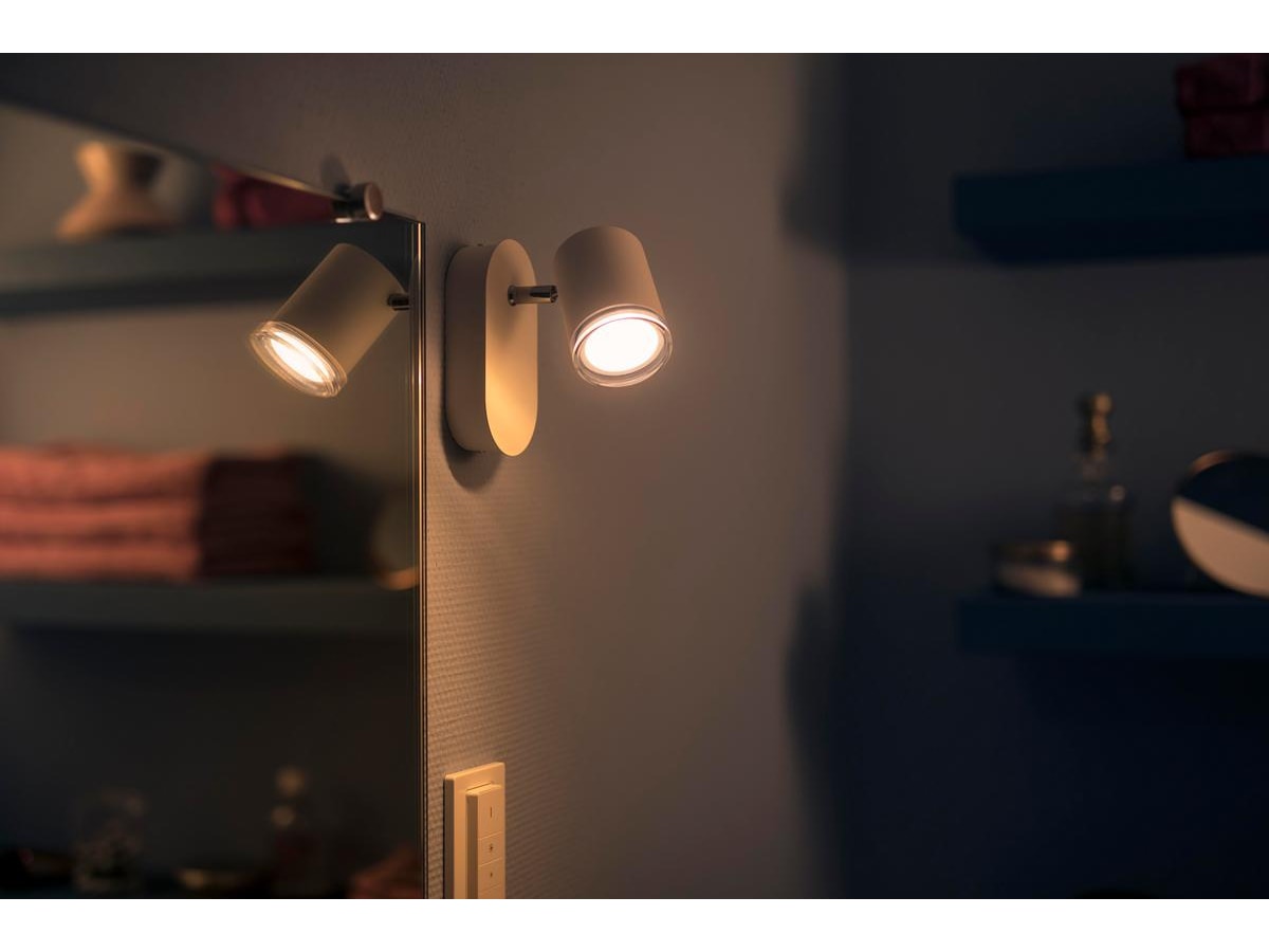 Denne spotlighten med ett dreibart hode funger fint på mindre baderom der det trengs lys over speilet. Leveres med én White ambiance GU10-lyskilde som kan endre fra et kaldt blått oppkvikkende lys til en varmere gul og avslappende nyanse.