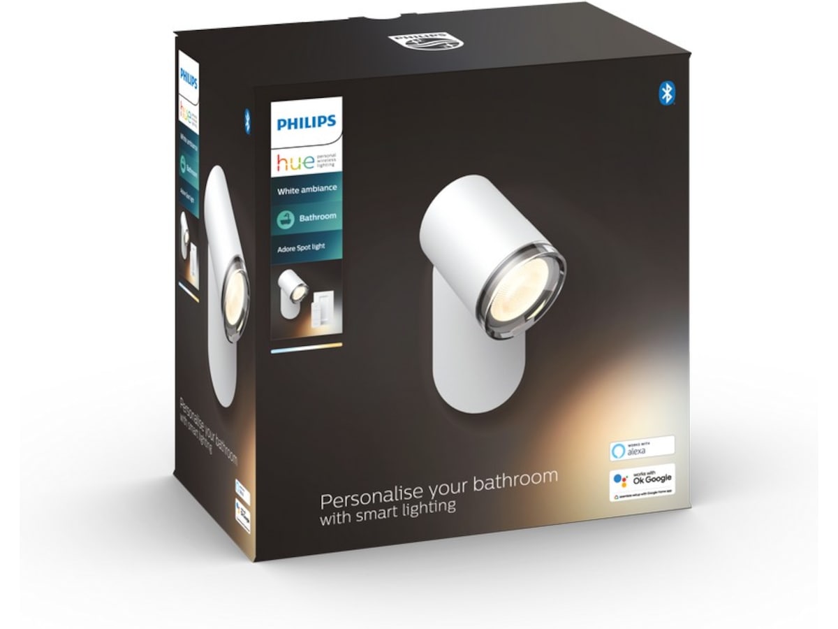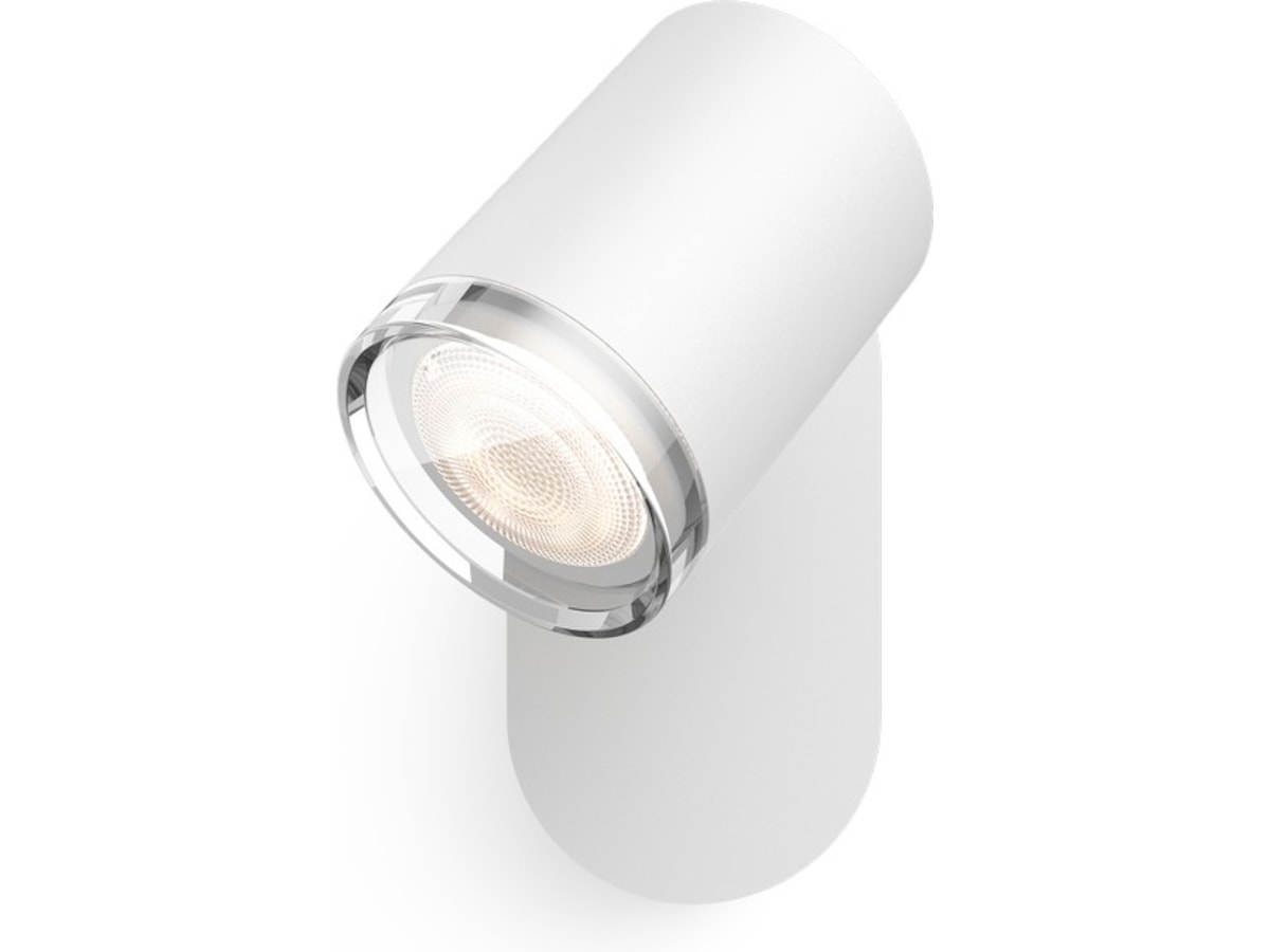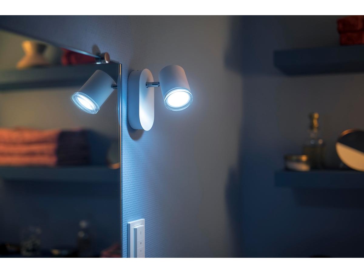 Denne spotlighten med ett dreibart hode funger fint på mindre baderom der det trengs lys over speilet. Leveres med én White ambiance GU10-lyskilde som kan endre fra et kaldt blått oppkvikkende lys til en varmere gul og avslappende nyanse.