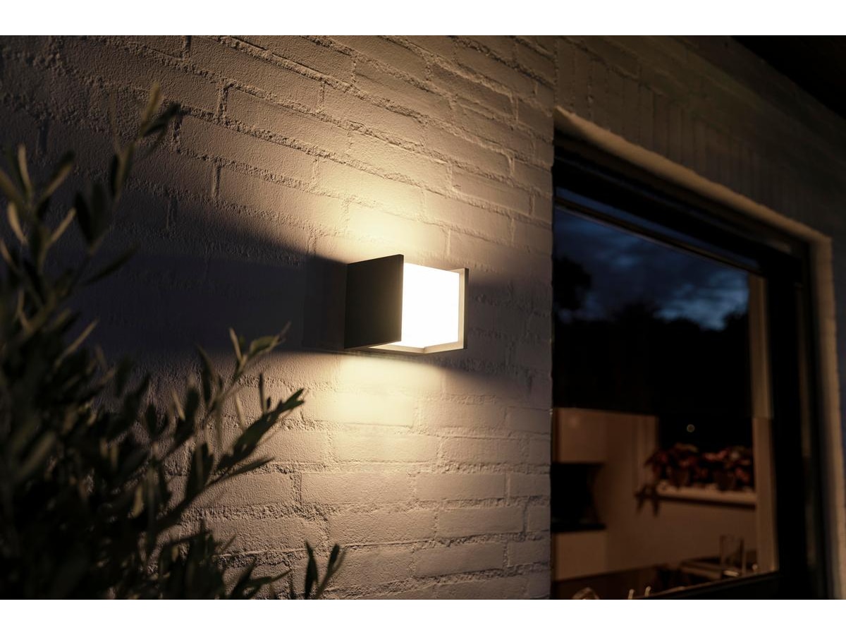Philips Hue Fuzo er en serie av moderne, kubiske utendørsarmaturer. Fuzo inngår i White-serien, noe som betyr at lyskilden kan dimmes og fjernstyres.