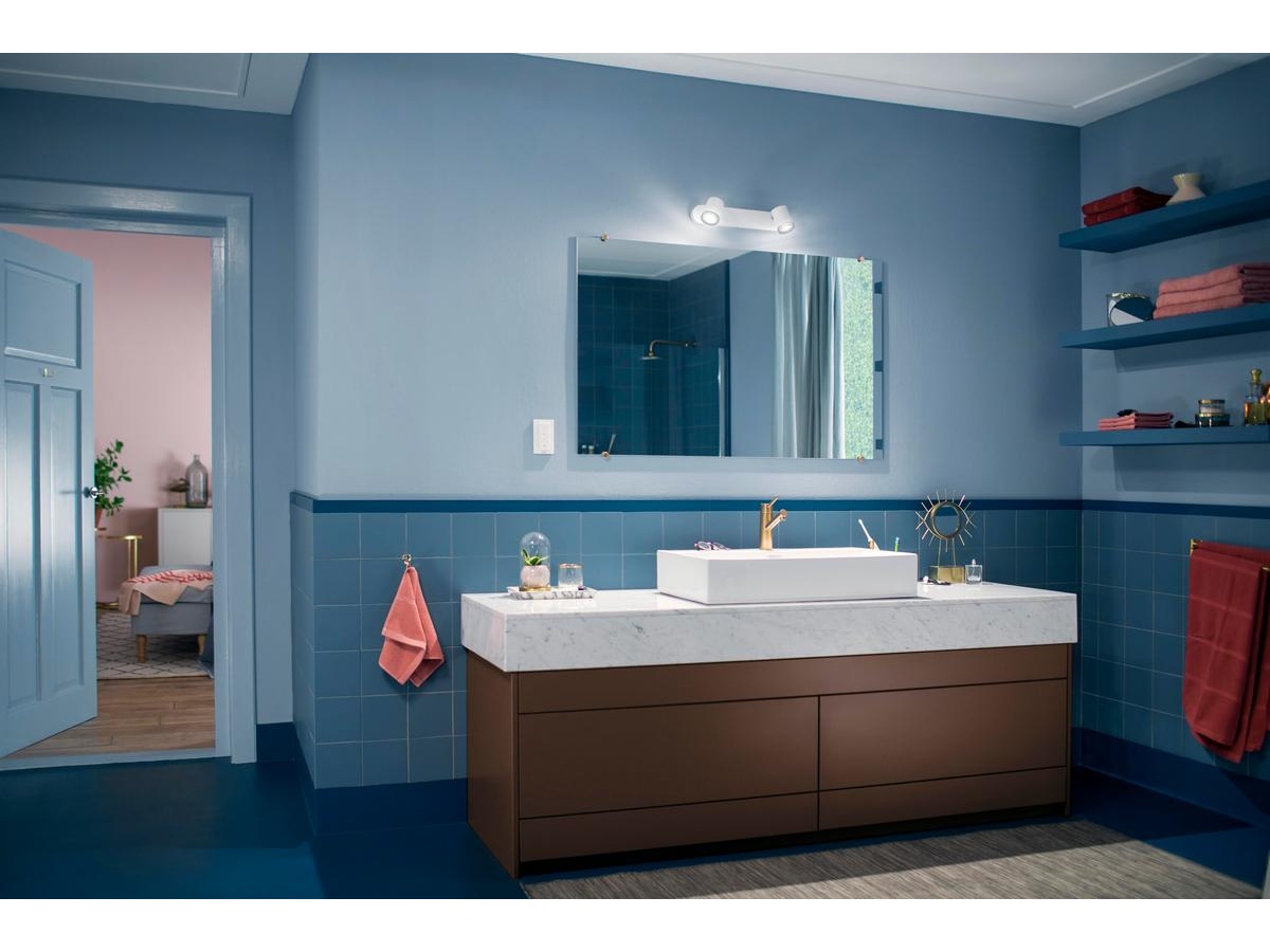Denne spotlighten med to dreibare hoder funger fint på mindre baderom der det trengs lys over speilet. Leveres med to White ambiance GU10-lyskilder som kan endre fra et kaldt blått oppkvikkende lys til en varmere gul og avslappende nyanse.