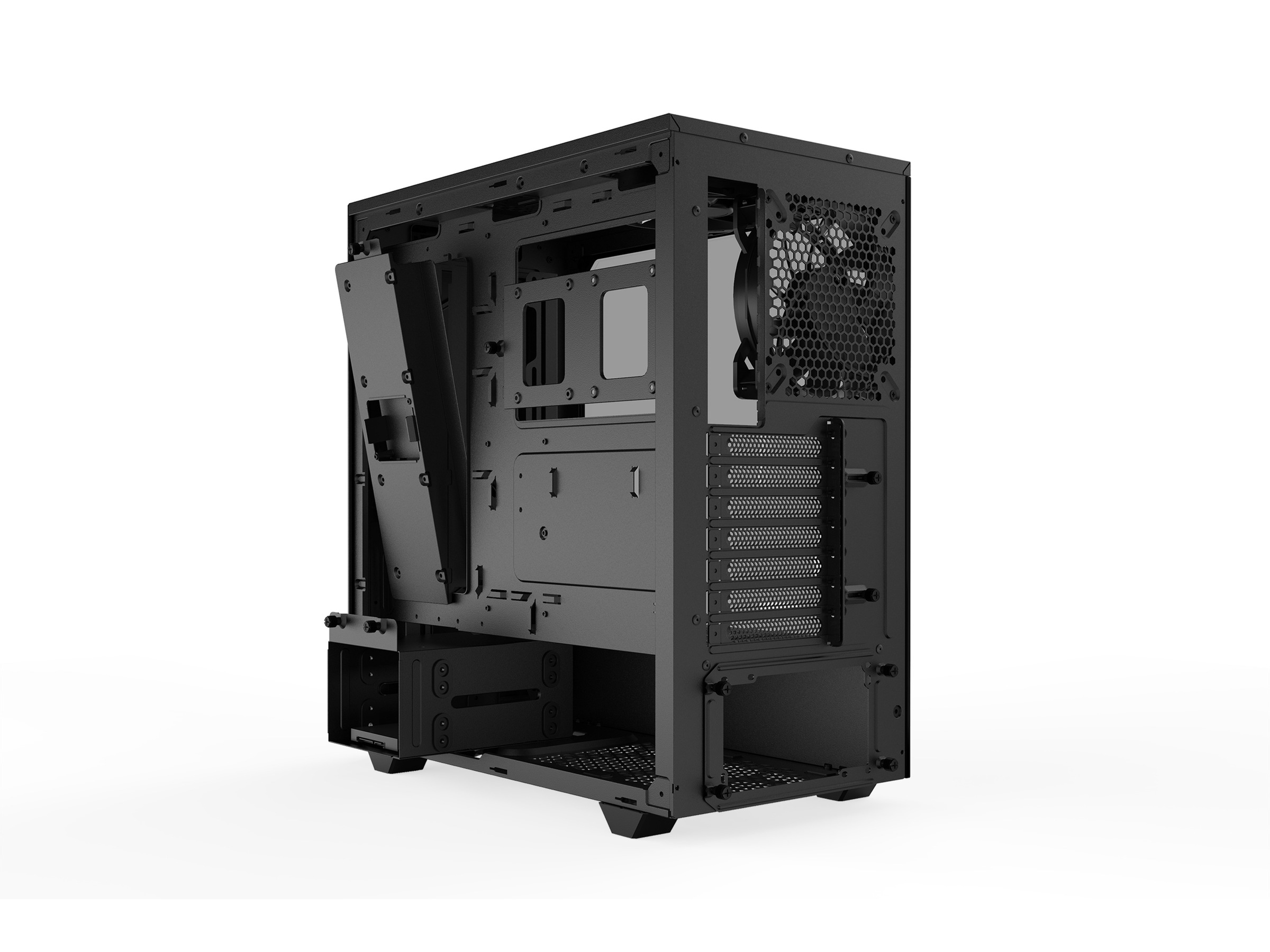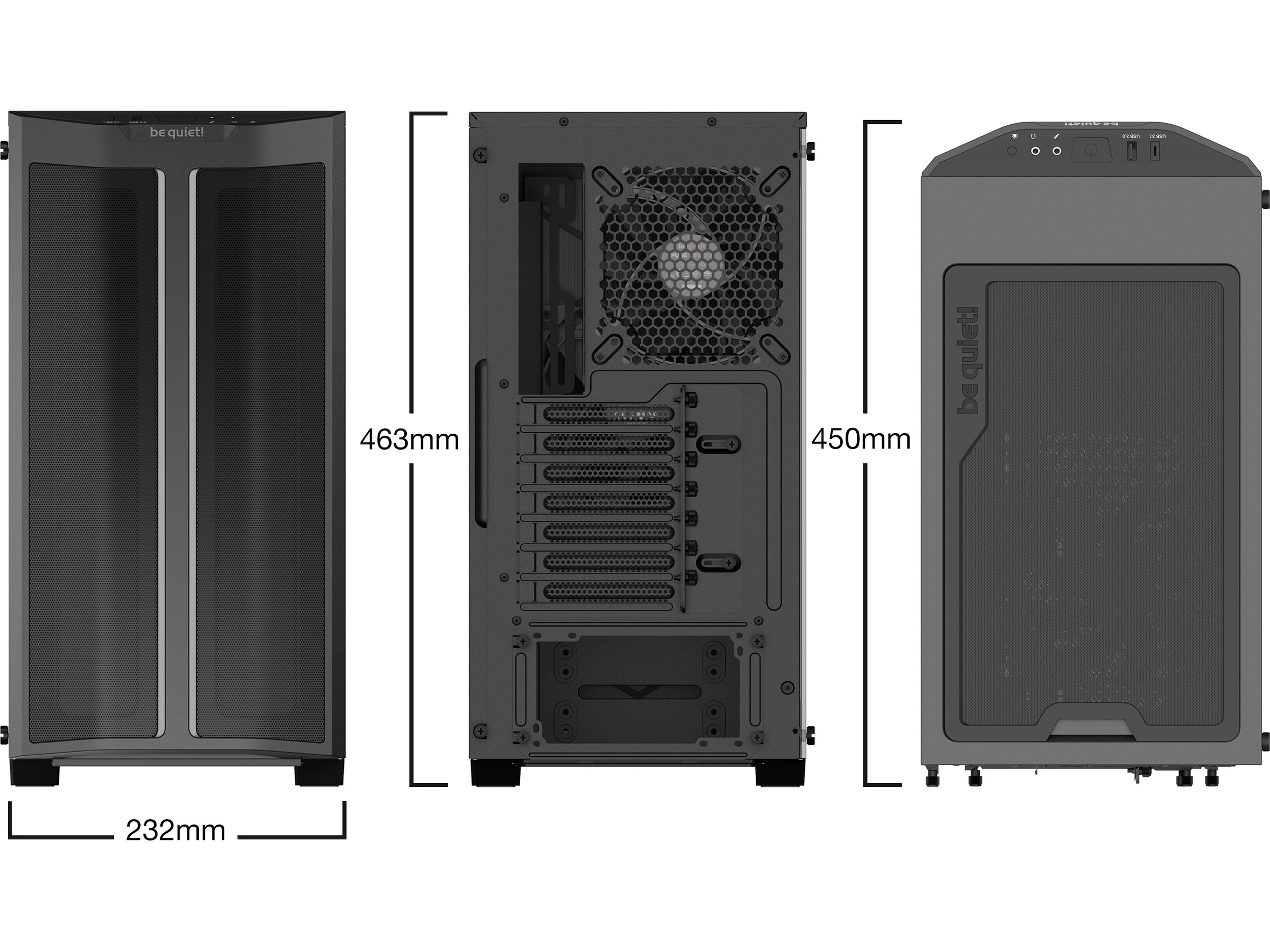 3 forinstallerte Pure Wings 2-vifter med luftstrøm-optimert vifteblader som sikrer perfekt luftstrøm og kjøling. Til tross for det kompakte kabinett-designen er viftene foran, på toppen og bak 140 mm modeller, noe som resulterer i en veldig stille drift. Opptil to 140 mm-vifter kan installeres i tillegg.