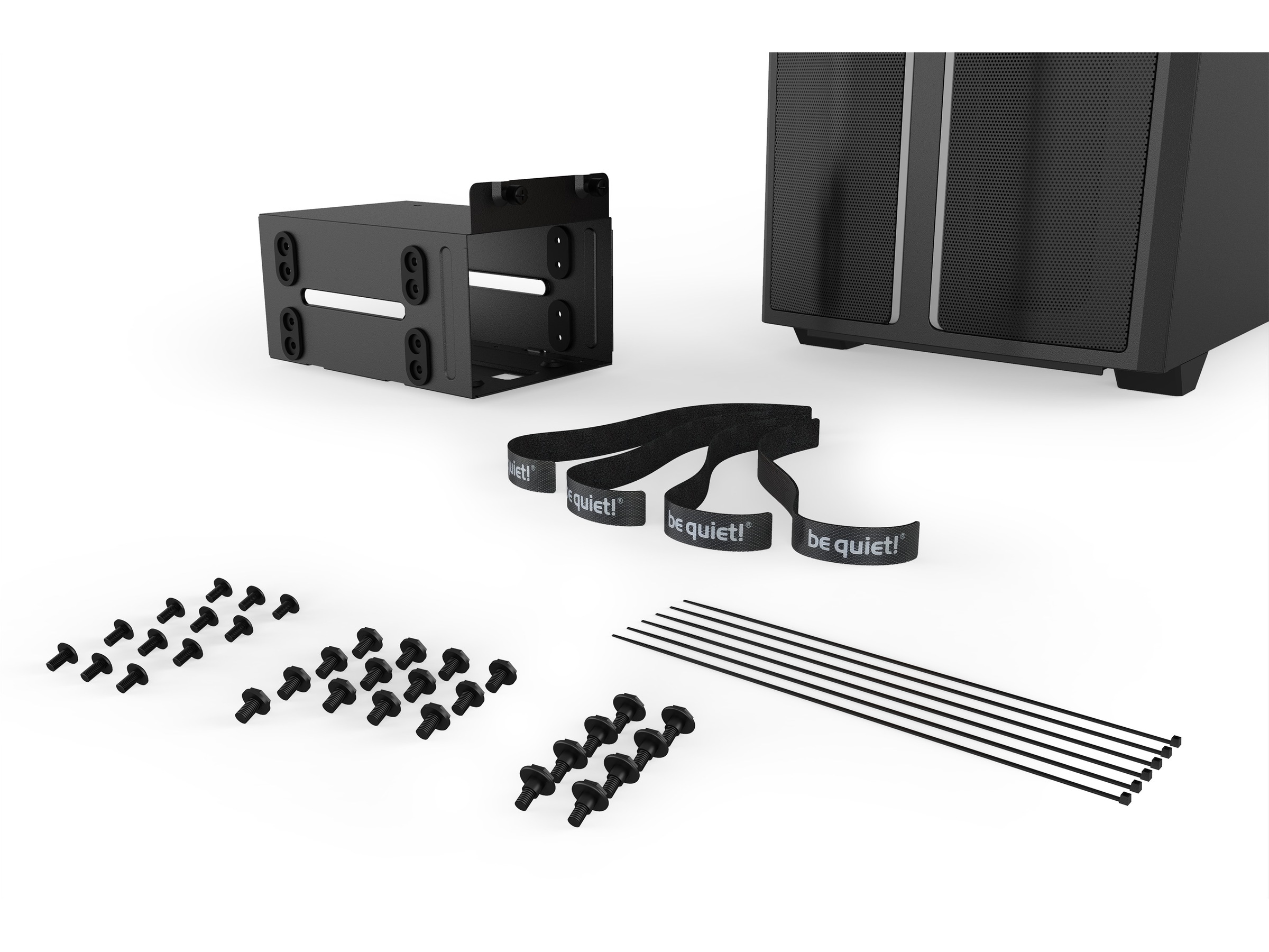 PSU-skjermen dekker perfekt kablene og PSU-en. Den inneholder også et dobbelt HDD-bur med avkoblede festepunkter som reduserer vibrasjoner og bidrar til å maksimere stillheten. Buret kan også rejusteres for å installere en radiator på opptil 360mm foran. Strømforsyningsenheten kan enkelt installeres bakfra, montert på PSU-festet som følger med.