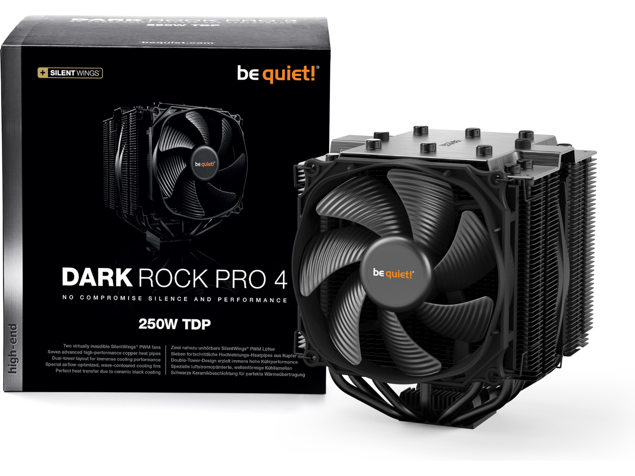 Dark Rock Pro 4 tilbyr en enorm kjøleytelse på 250 W TDP og praktisk talt lydløs drift. Utmerket for overklokkede systemer og krevende arbeidsstasjoner.
