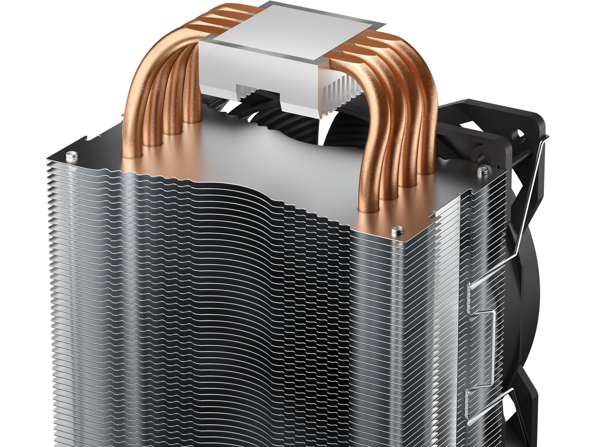 Pure Rock 2 is equipped with four 6mm heat pipes that have aluminum caps. This is key to its great cooling performance, because they transport the heat to optimum locations on the cooling fins.