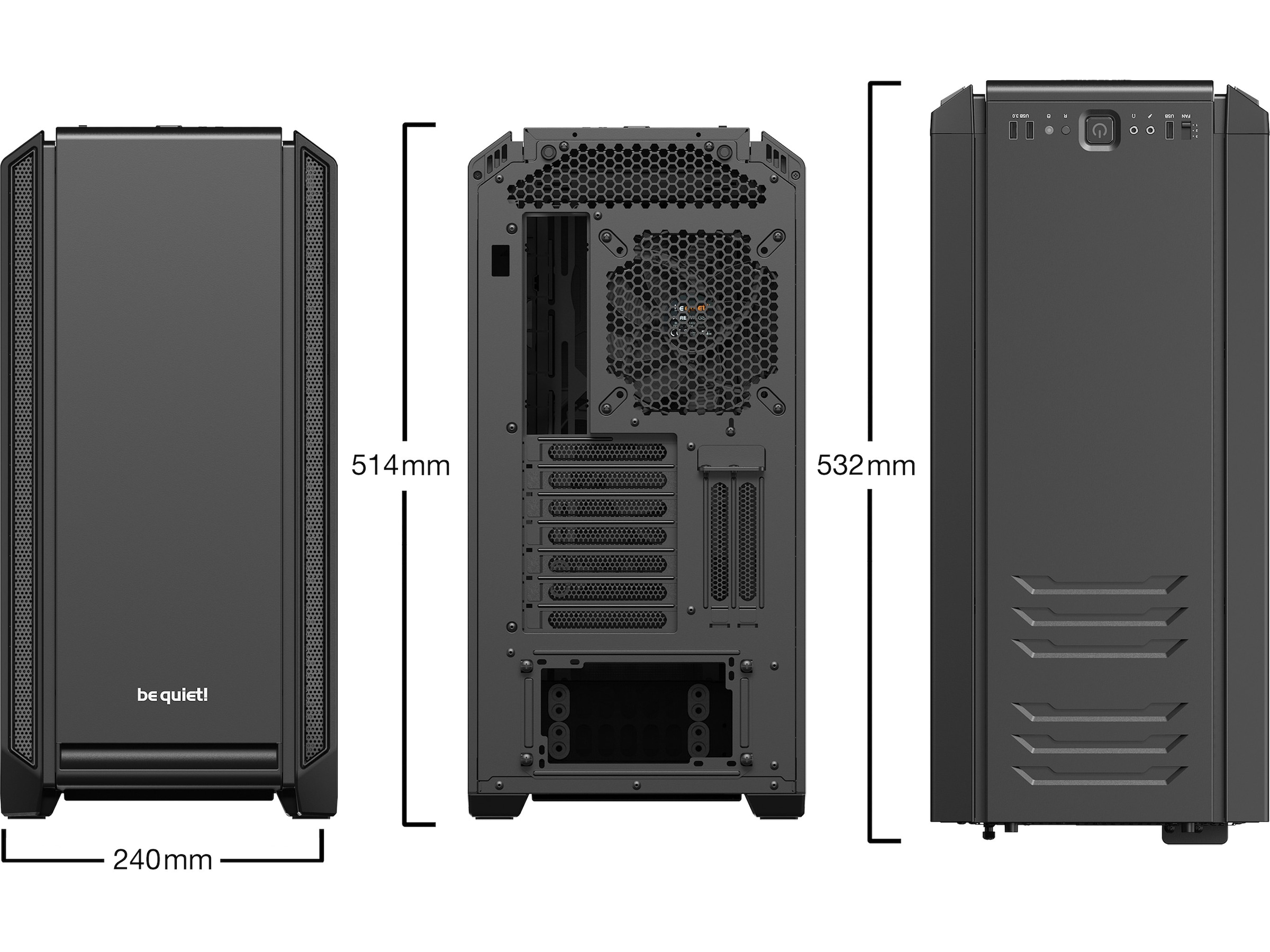 2 forhåndsinstallerte Pure Wings 2 140 mm vifter med luftstrømsoptimaliserte vifteblader sikrer en perfekt luftstrøm og solid kjøling. Den integrerte 3-trinns viftekontrollen har plass til opptil 3 vifter.