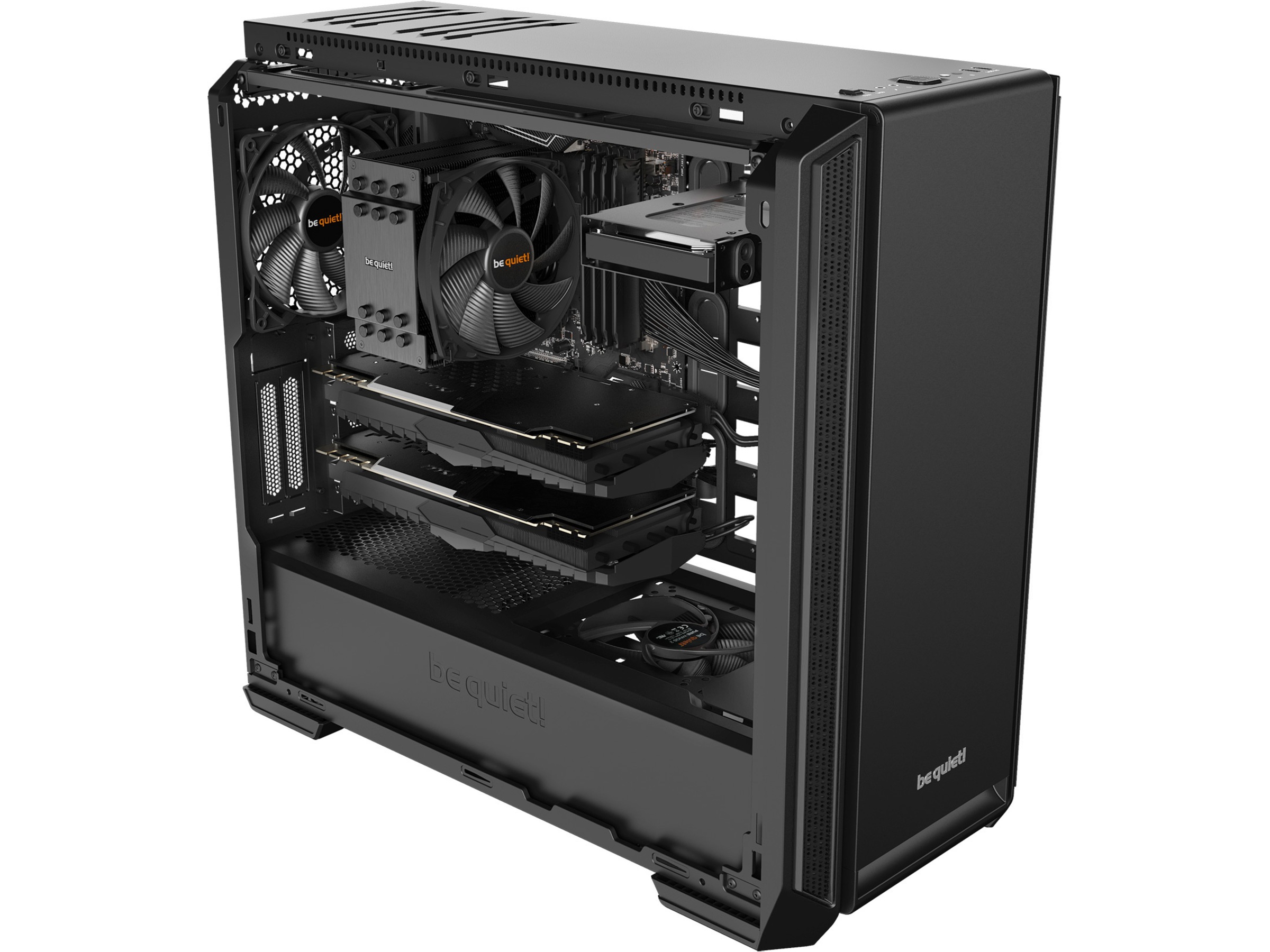 Til tross for sin kompakte design, gir Silent Base 601 Window sjenerøse dimensjoner og utskjæringer, også for installering av et E-ATX-hovedkort. Det smarte arrangementet av komponentene gjør også at flere skjermkort og store kjølere passer godt inn.