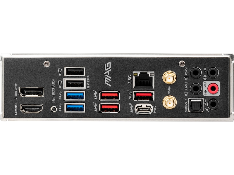 Grensesnitt 1 x mikrofon - minijakk, 1 x LAN (2.5Gigabit Ethernet), 3 x USB 3.2 Gen 2, 1 x DisplayPort, 2 x USB 3.2 Gen 1, 1 x lydutlinje - minijakk, 1 x lydutlinje (bakre) - minijakk, 1 x lydutlinje (senter/subbasshøyttaler) - minijakk, 1 x USB-C Gen2x2, 1 x TOSLINK, 2 x USB 2.0, 1 x HDMI, 1 x lydinnlinje - minijakk