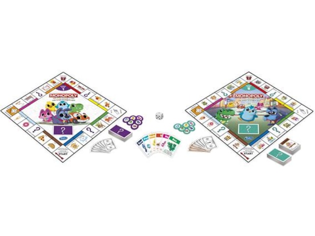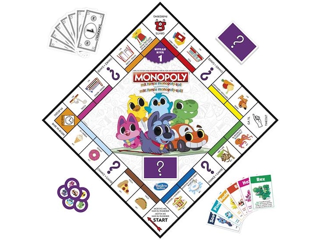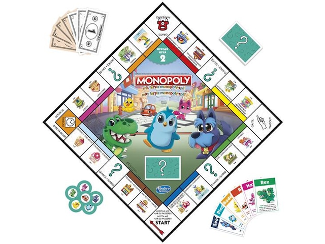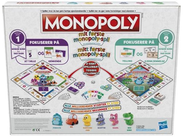 Den ene siden fokuserer på å telle og matche, og anbefales til barn i alderen 4 til 5 år. Snu brettet for et mer avansert spill som fokuserer på lesing og enkel matematikk – anbefales til barn fra 6 år. Hvert spillnivå har sine egne Monopol-penger og -kort samt regler. Spillet er inspirert av det klassiske Monopol-spillet – alle milliardærer må jo begynne et sted!