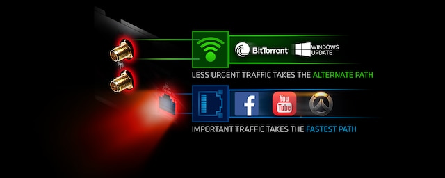 ● Intelligens: Killer Prioritization Engine for automatisk å klassifisere og prioritere trafikk med høy prioritet, som online-spill, streaming av video og lyd av høy kvalitet som skal håndteres av systemets raskeste nettverksgrensesnitt. Dette vil gi brukerne en opplevelse av høyere kvalitet med færre avbrudd.