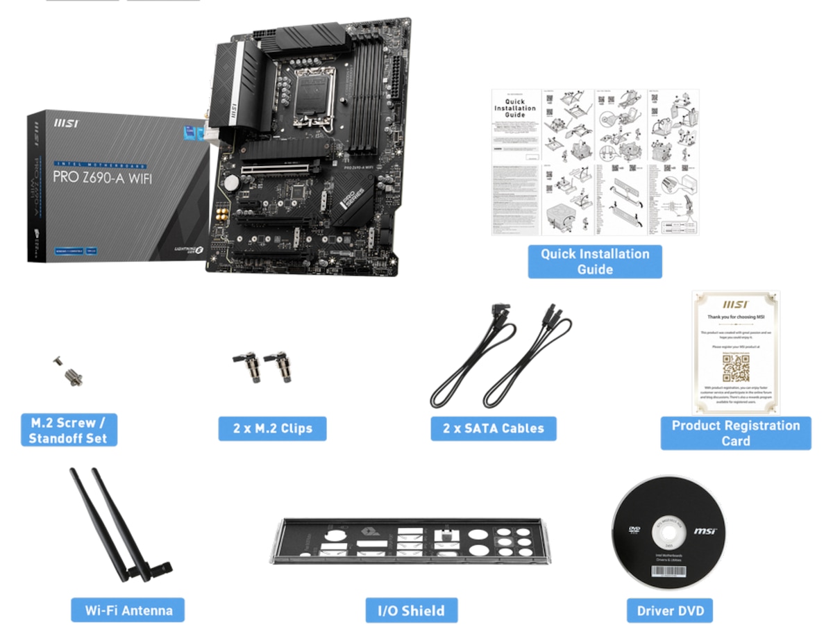 Avstandsdel for M.2-sokkel, 1 x M.2 skrue, 2 x M.2 klips, I/O-bakplate, Wi-Fi-antenne |