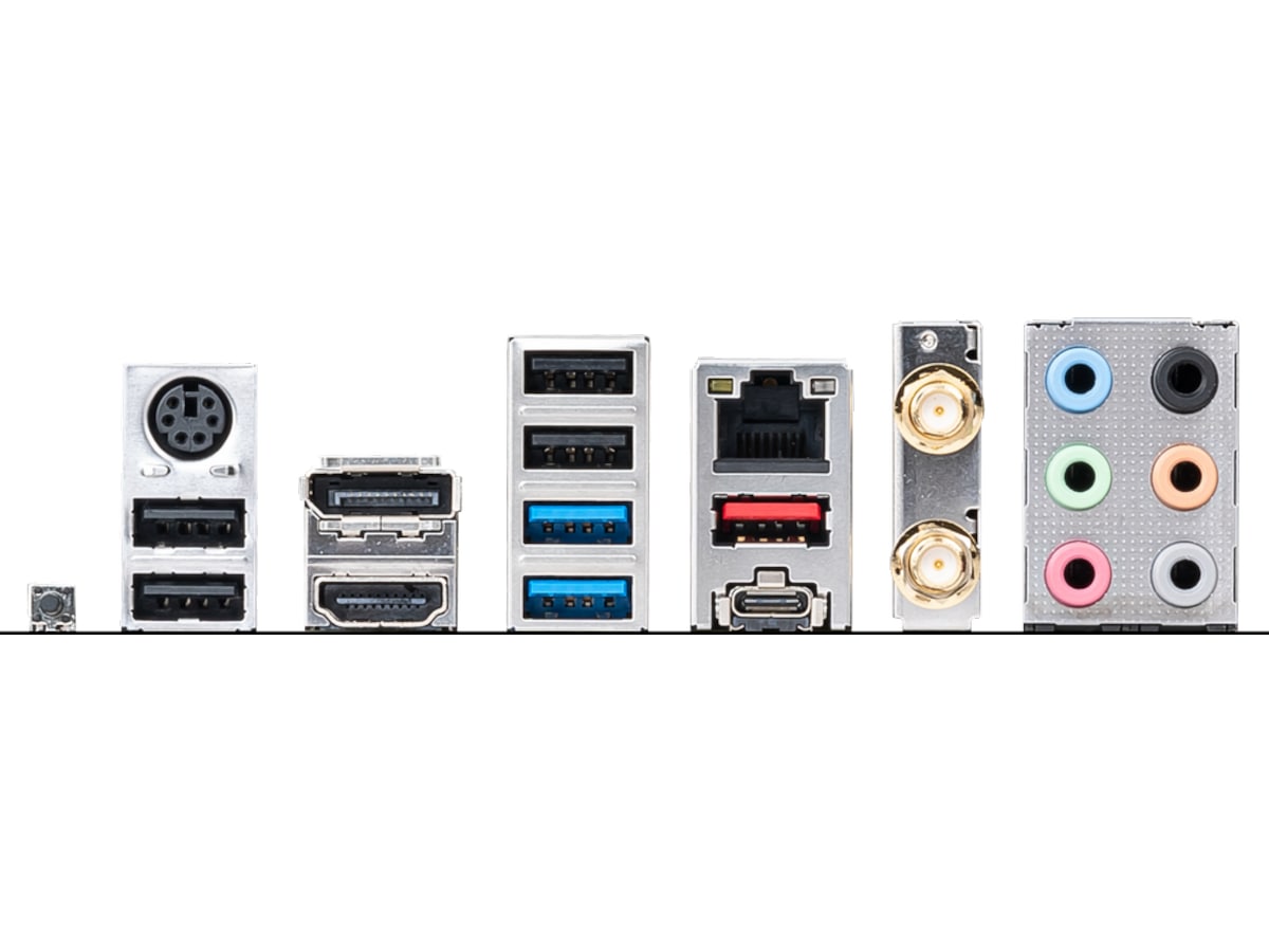 1 x mikrofon - minijakk, 1 x lydinnlinje - minijakk, 1 x DisplayPort, 1 x USB-C Gen2x2, 1 x lydutlinje (bakre) - minijakk, 1 x LAN (2.5Gigabit Ethernet), 4 x USB 2.0, 2 x USB 3.2 Gen 1, 1 x lydutlinje - minijakk, 1 x HDMI, 1 x lydutlinje (side-surround) - minijakk, 1 x USB 3.2 Gen 2, 1 x lydutlinje (senter/subbasshøyttaler) - minijakk, 1 x PS/2-tastatur / -mus |