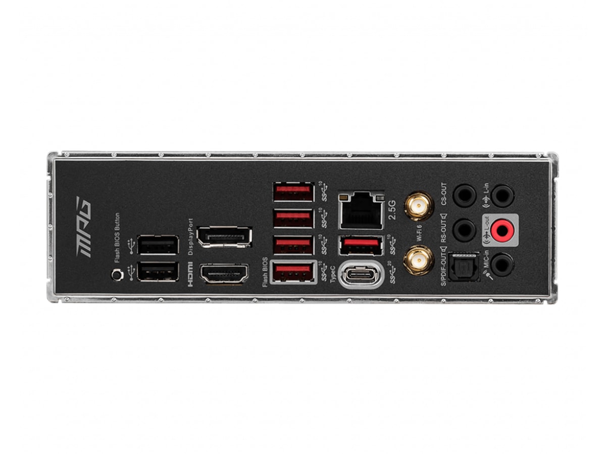 1 x USB-C Gen2x2, 1 x DisplayPort, 5 x USB 3.2 Gen 2, 2 x USB 2.0, 1 x TOSLINK, 1 x lydutlinje (senter/subbasshøyttaler) - minijakk, 1 x LAN (2.5Gigabit Ethernet), 1 x lydinnlinje - minijakk, 1 x lydutlinje (bakre) - minijakk, 1 x lydutlinje - minijakk, 1 x mikrofon - minijakk, 1 x HDMI
