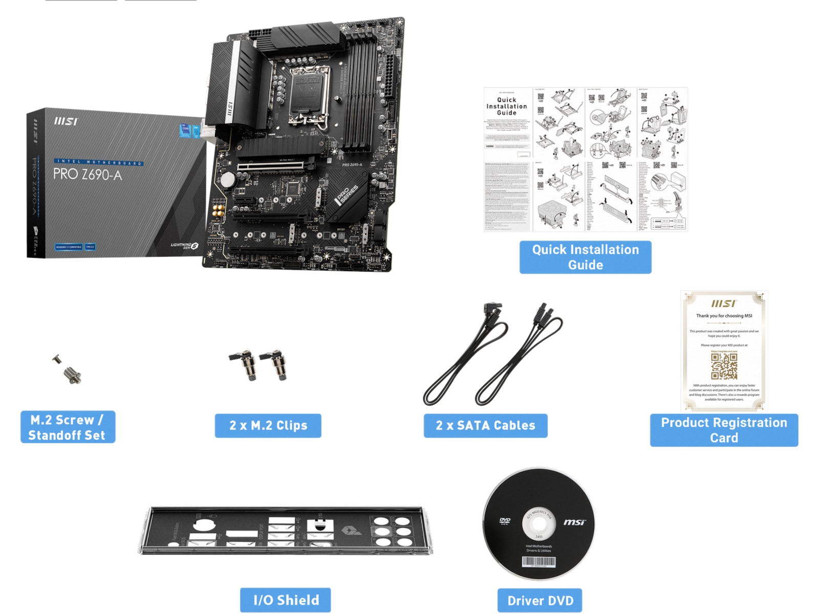 1 x M.2 skrue, Wi-Fi-antenne, Avstandsdel for M.2-sokkel, 2 x M.2 klips, I/O-bakplate |