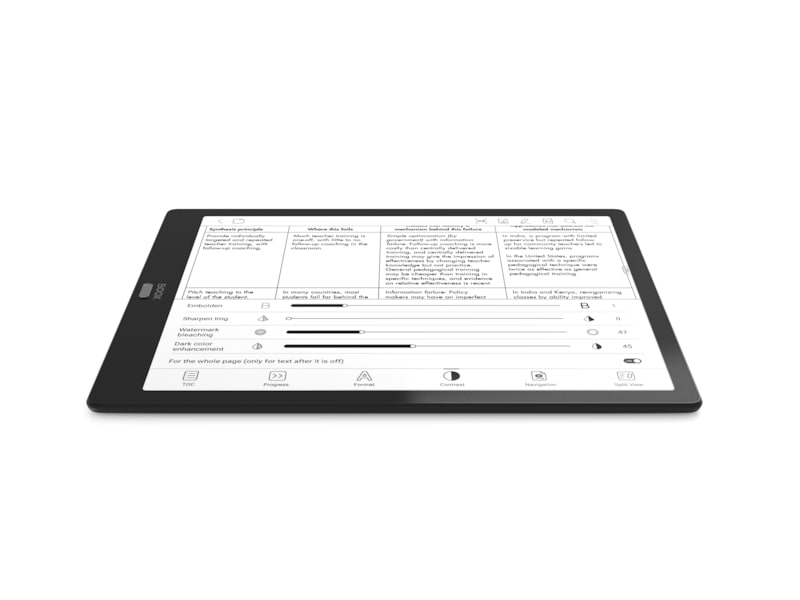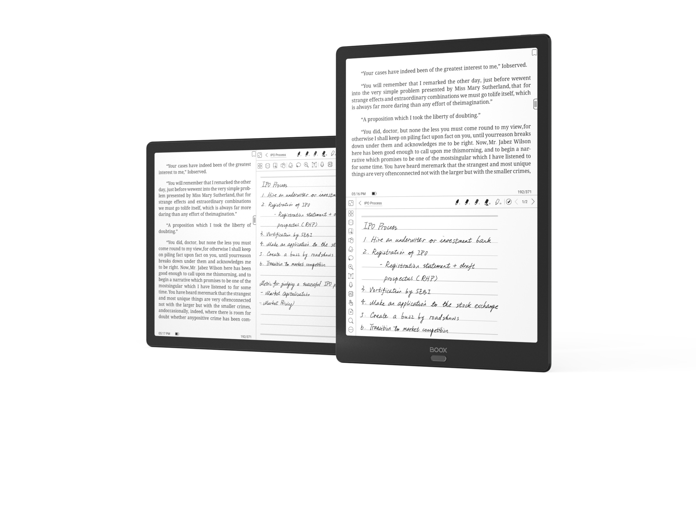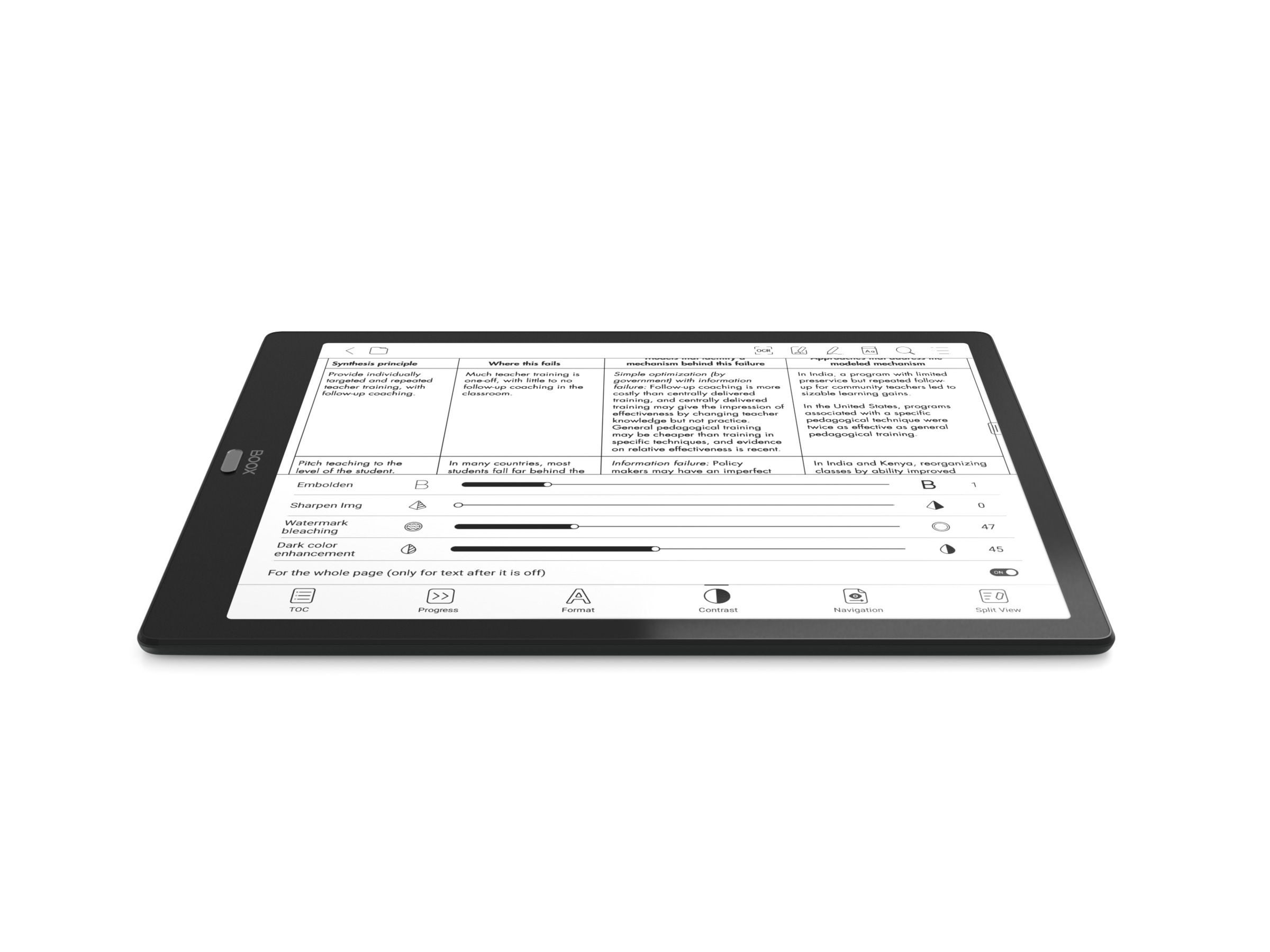 Den 13,3" store E Ink Mobius Carta-skjermen med SNOW Field-funksjon er ideell for å vise dokumenter som inneholder grafer og diagrammer, så vel som alle PDF- eller DjVu-dokumenter. Fraværet av flimrende bakgrunnsbelysning og prinsippet om bildedannelse ved bruk av «elektronisk blekk»-metoden gjør det behagelig for øynene å lese. Skjermen har omtrent samme størrelse som et A4-ark og lar deg se selv enkle skannede sider uten å måtte zoome i dem.