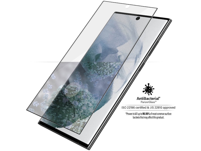 En PanzerGlass™-skjermbeskytter fungerer som en diskret kollisjonspute for å beskytte enheten din. Det herdede glasset absorberer støt og sikrer høy motstand mot riper. Den har et anti-fingeravtrykkbelegg som hjelper deg med å holde enheten fri for flekker. Dessuten inneholder belegget et aktivt antimikrobielt stoff som dreper bakterier på glasset. Det er bevist å drepe opptil 99,99 % av de vanligste overflatebakteriene og er godkjent for bruk i EU (BPR) og USA (EPA).