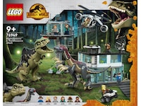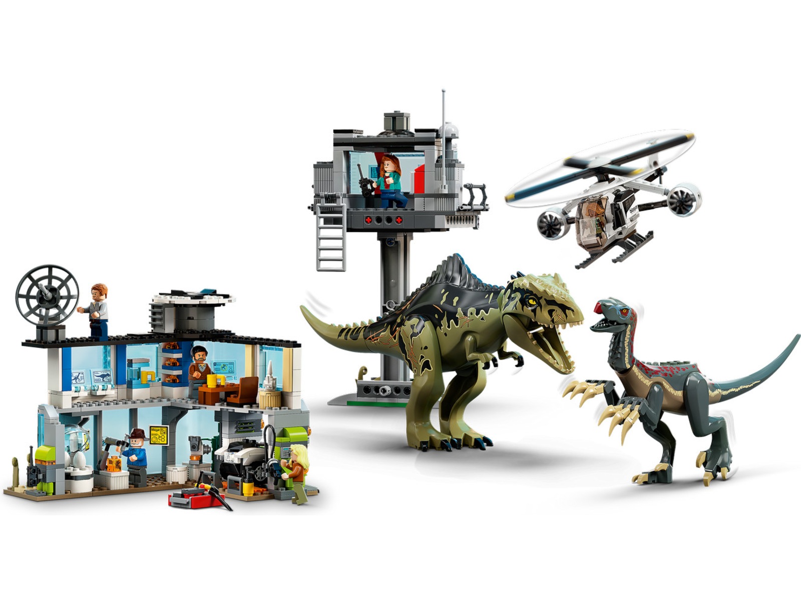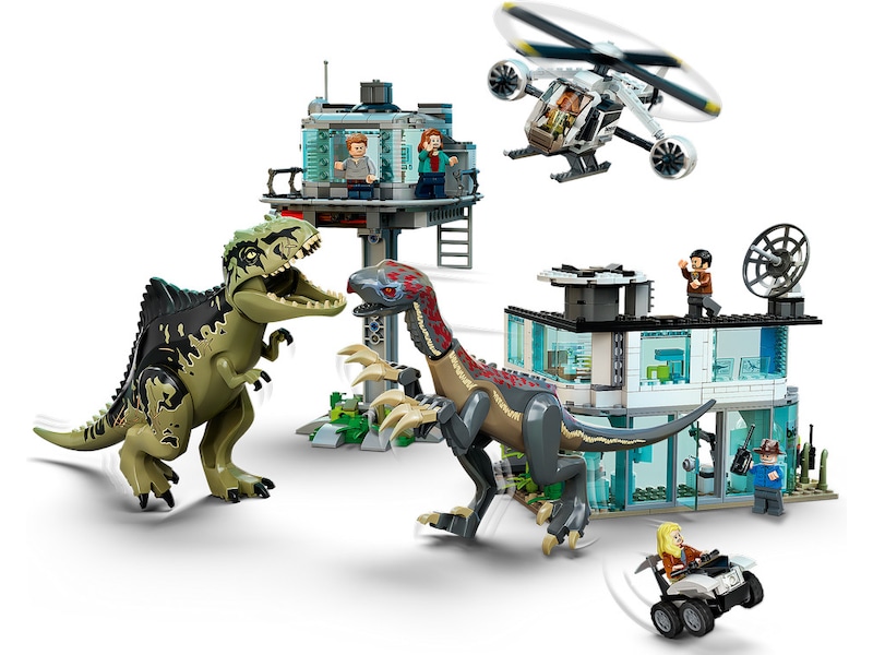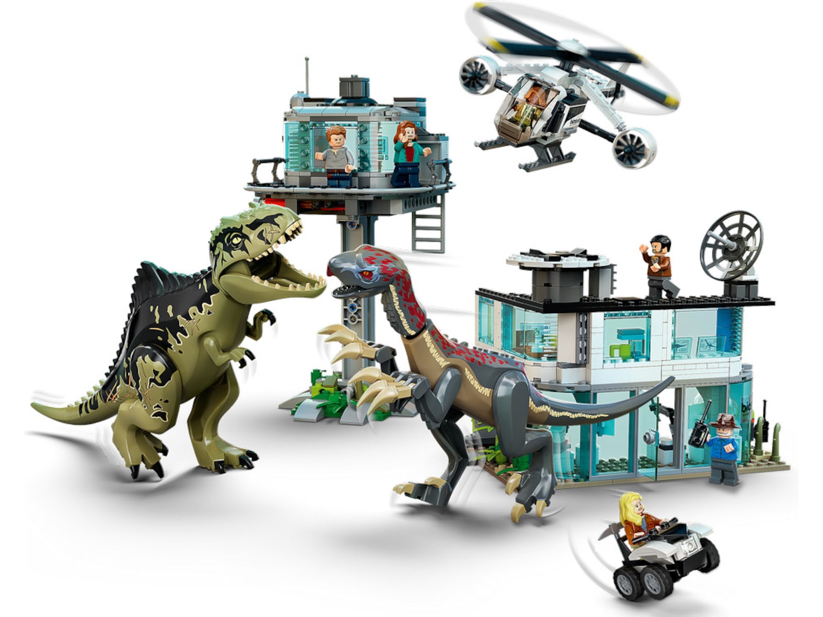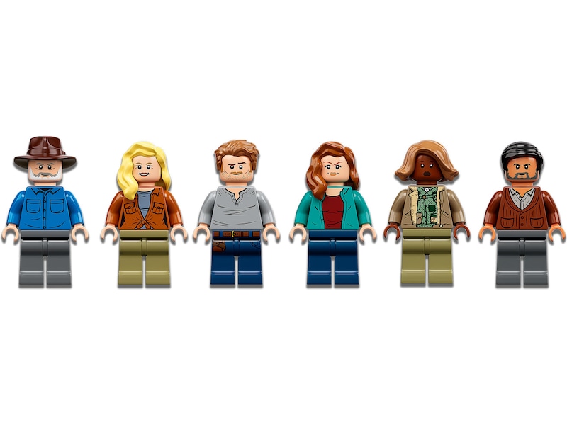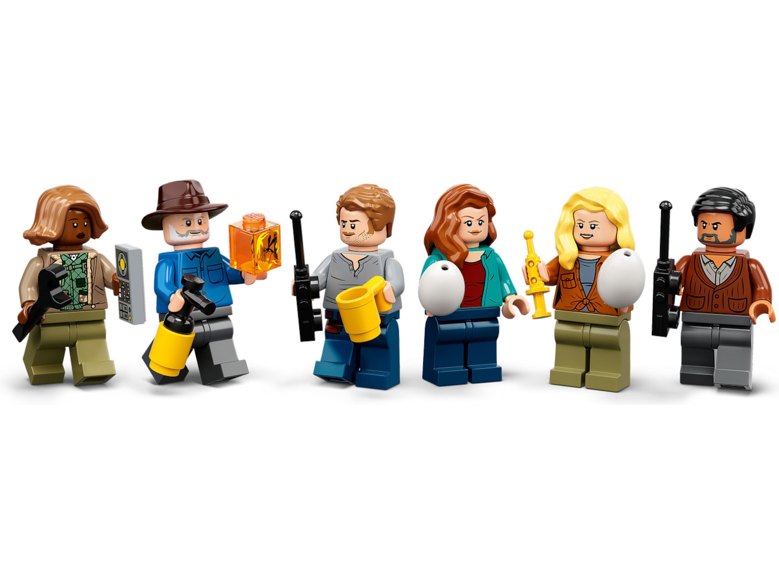 - Seks minifigurer – Owen Grady, Claire Dearing, Dr. Alan Grant, Dr. Ellie Sattler, Kayla Watts og Dr. Henry Wu. Inkluderer også en bevegelig, 32 cm lang giganotosaurus og en therizinosaurus