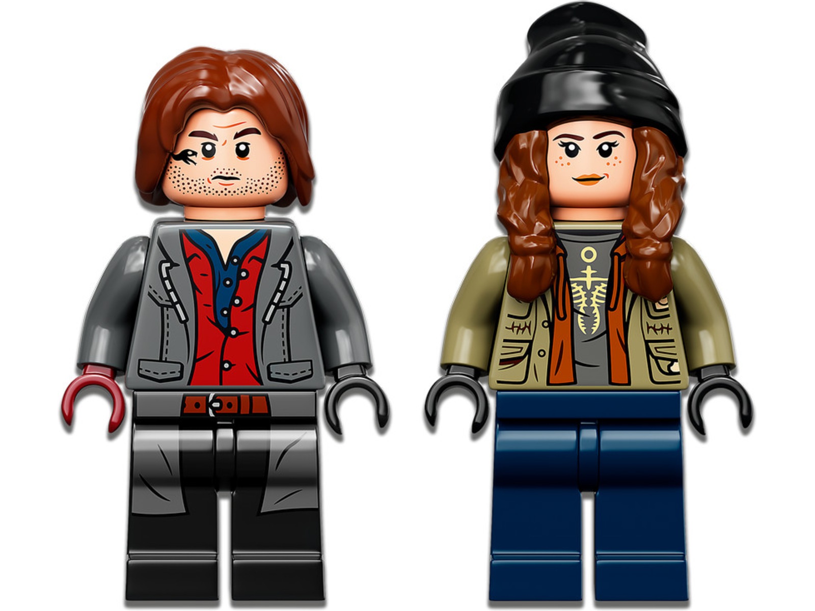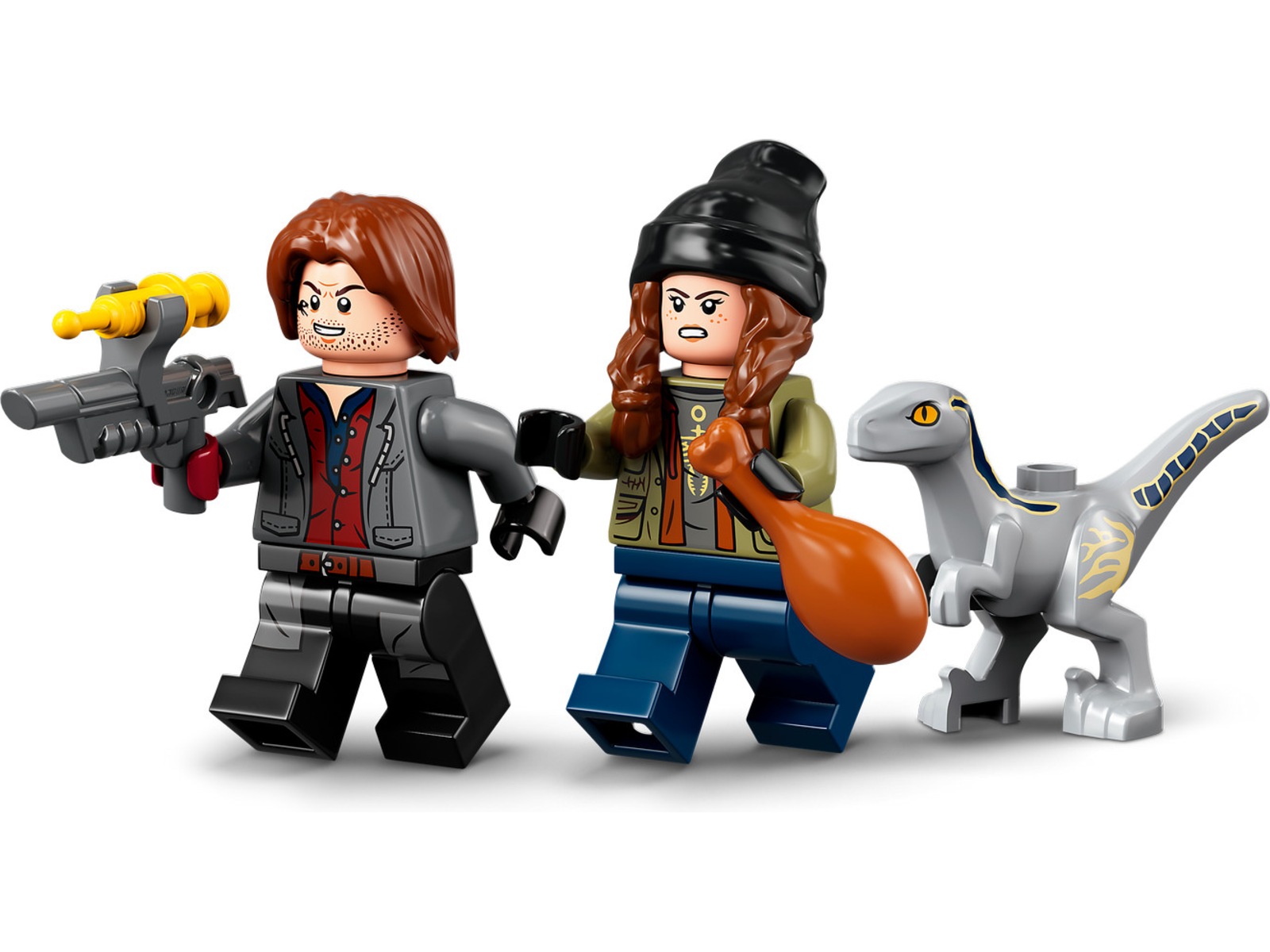 - To LEGO® minifigurer og to dinosaurer – Maisie og Rainn Delacourt med bedøvelsespistol, en bevegelig dinosaurfigur av Blue og en dinosaurfigur av Beta for gøyal rollelek