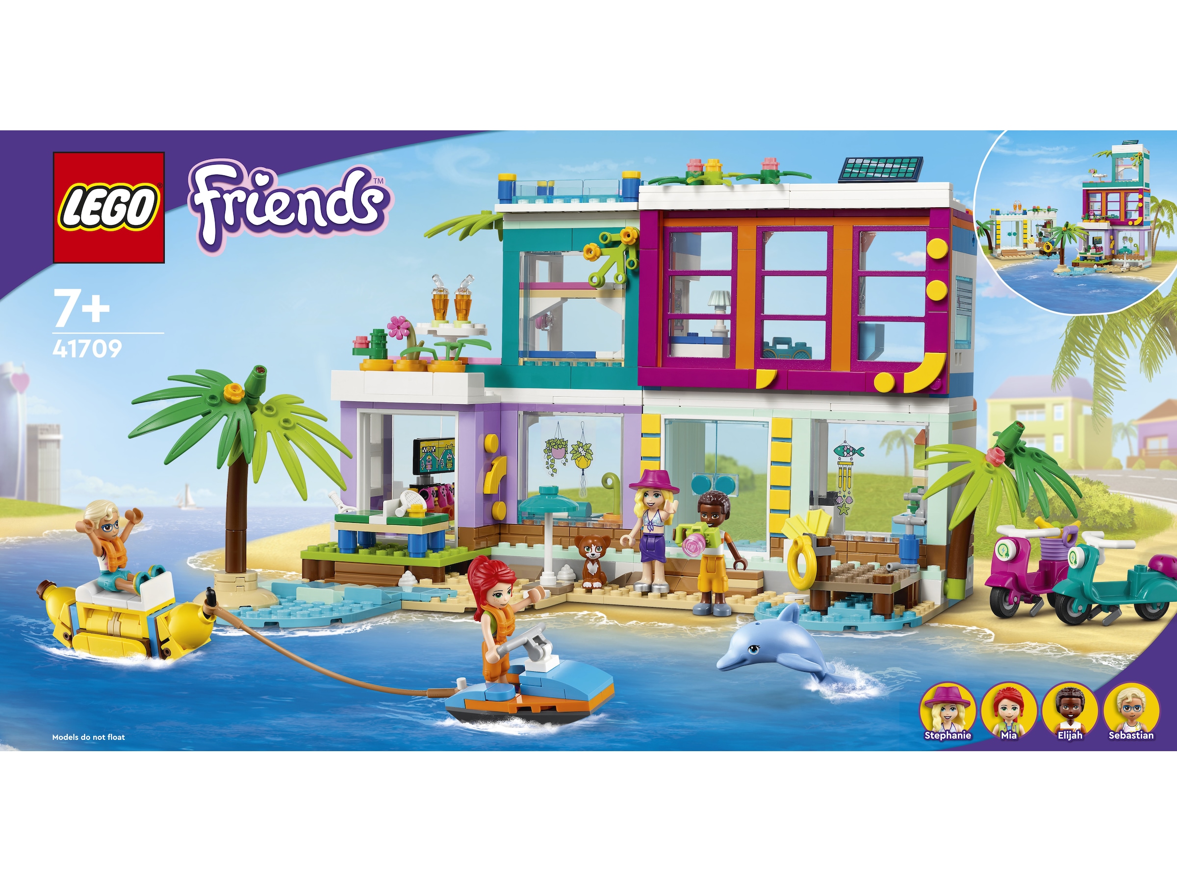 - LEGO® Friends gave med seks karakterer – settet Feriehus på stranden (41709) inneholder fire minidukker, inkludert LEGO Friends Mia, og figurer av en delfin og en katt