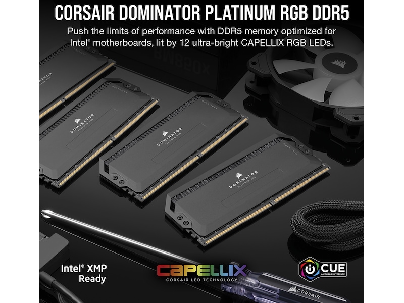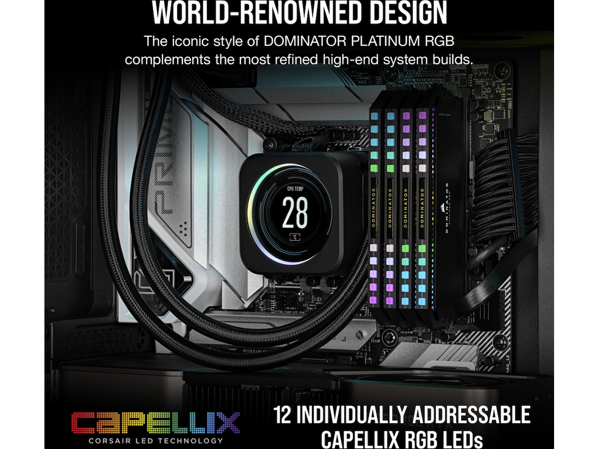 Høyytelses PCB, Dual-path Heat Xchange (DHX), Anodized aluminum heatspreader, Intel Extreme Memory Profiles (XMP 3.0), Innebygd Power Management IC (PMIC), 12 ultralyse individuelt adresserbare CAPELLIX RGB LED-er, Dynamisk flersone RGB-belysning, Corsair iCUE-støtte