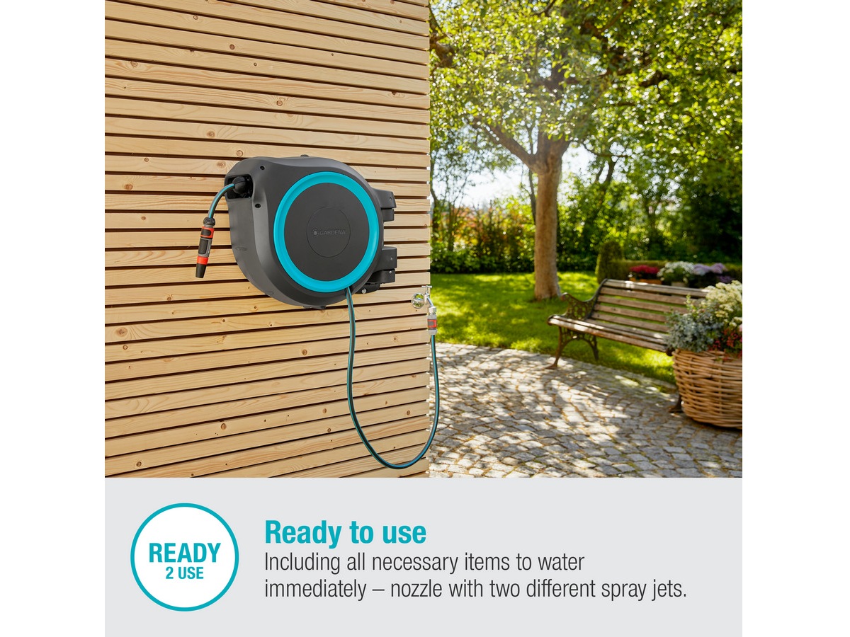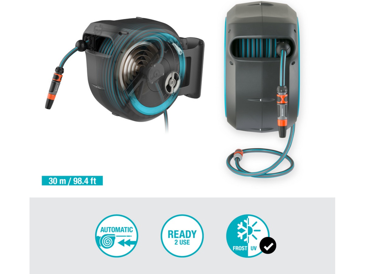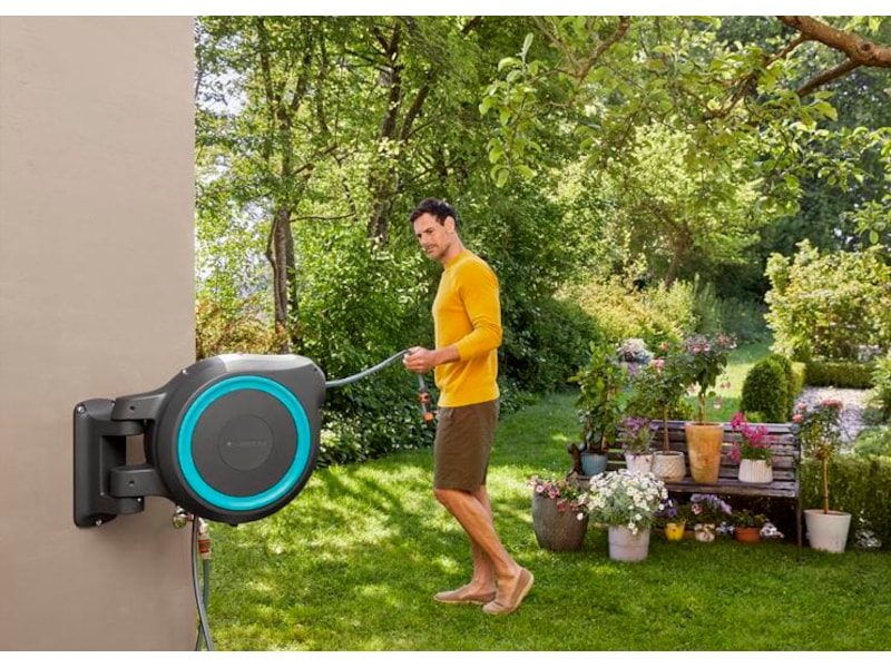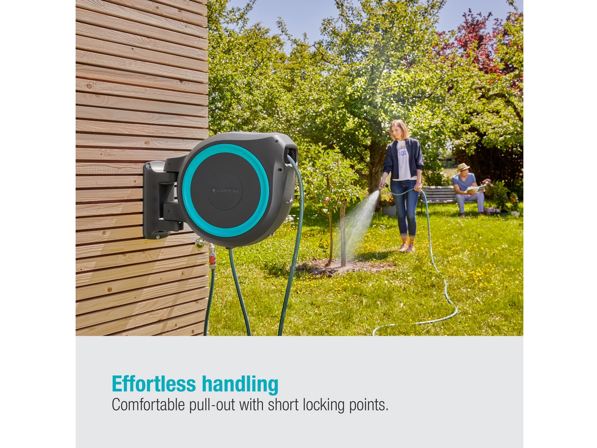 Trekk ut den 30 meter lange slangen til ønsket lengde under bruk. Når du stopper, kobles de ekstra korte låsepunktene inn for å låse slangen. Den praktiske veggbraketten gjør at slangetrommelen kan dreies 180° for å følge bevegelsene dine rundt i hagen. Dette gjør det lett å vanne i hagen, med maksimal bevegelsesfrihet og en slange som ikke floker seg.