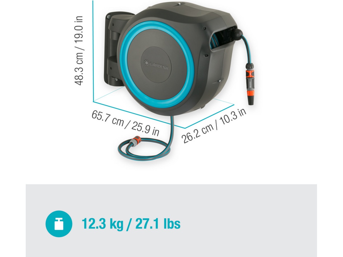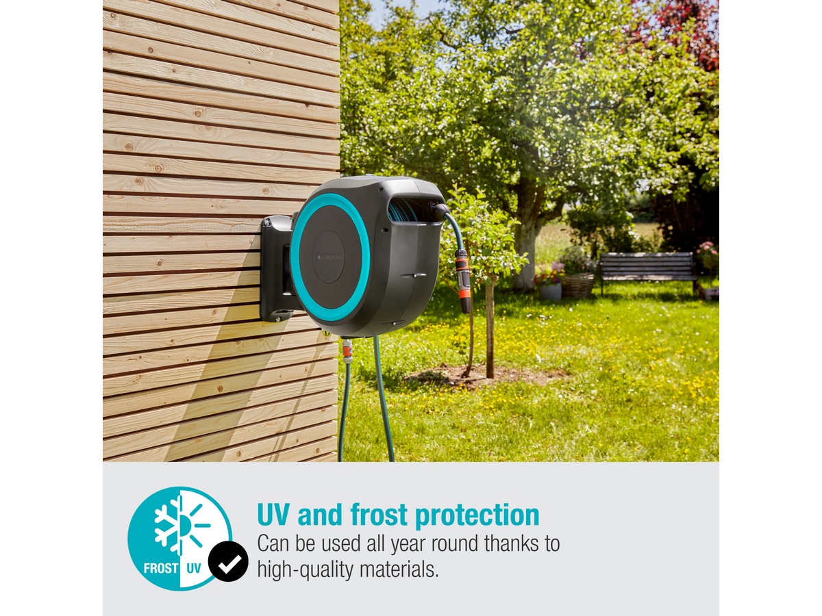 Materialet av høy kvalitet beskytter mot all slags vær, da den er UV-bestandig og frostsikker og derfor kan brukes året rundt. Boksen er tyverisikret. Slangeboksen leveres med alle delene du trenger: en veggbrakett, en forbindelsesslange, alle nødvendige Original GARDENA System- og monteringsdeler og en dyse som lar deg velge mellom to ulike stråler. GARDENA gir 5 års garanti på denne slangeboksen av høy kvalitet.
