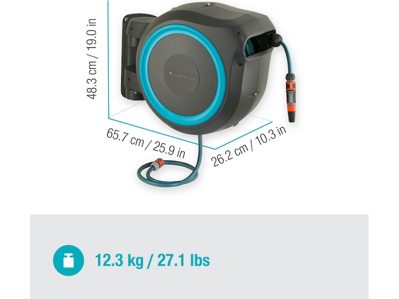 Den integrerte slangeføringen hindrer skade på vannslangen ved å eliminere floker og knekk når den ruller opp slangen. Kran og slangekoblinger fra Original GARDENA System gjør det lett å forlenge slangen eller feste den til annet vanningstilbehør fra GARDENA. Slangetilbehøret fra GARDENA er alltid klart til bruk. Det kan festes under veggbraketten og oppbevares der for å spare plass.
