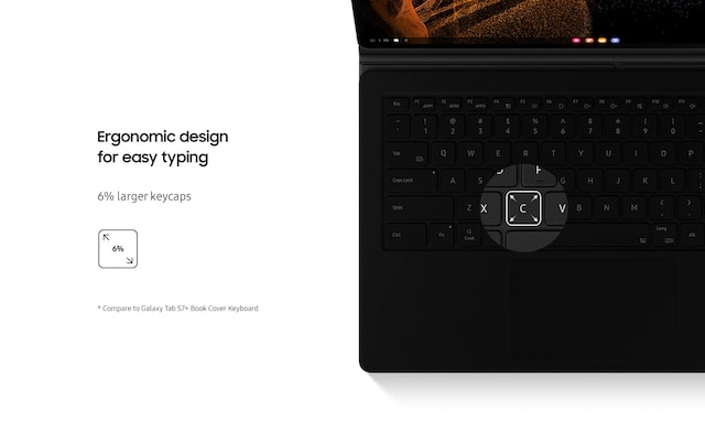 Med Book Cover Keyboard er det mye lettere å få ting gjort. En større styreplate på tastaturet gir deg en sømløs opplevelse. Og med DeX jobber du som på en PC med et enkelt trykk. Dessuten kan nettbrettet brukes under alle lysforhold med 3-trinns justerbar bakgrunnsbelysning på tastaturet.