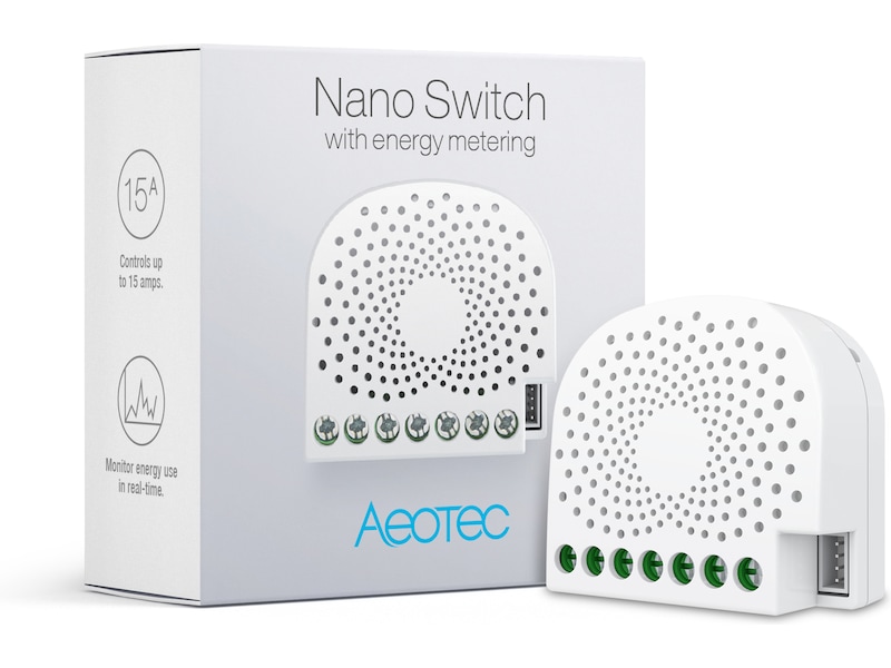 Den gir automatisering og tidsstyring, og kan også overvåke strømforbruket. Nano Switch kommer i en utgave med Aeotecs supernøyaktige energimålerteknologi som registrerer strømforbruket med 99 % nøyaktighet.